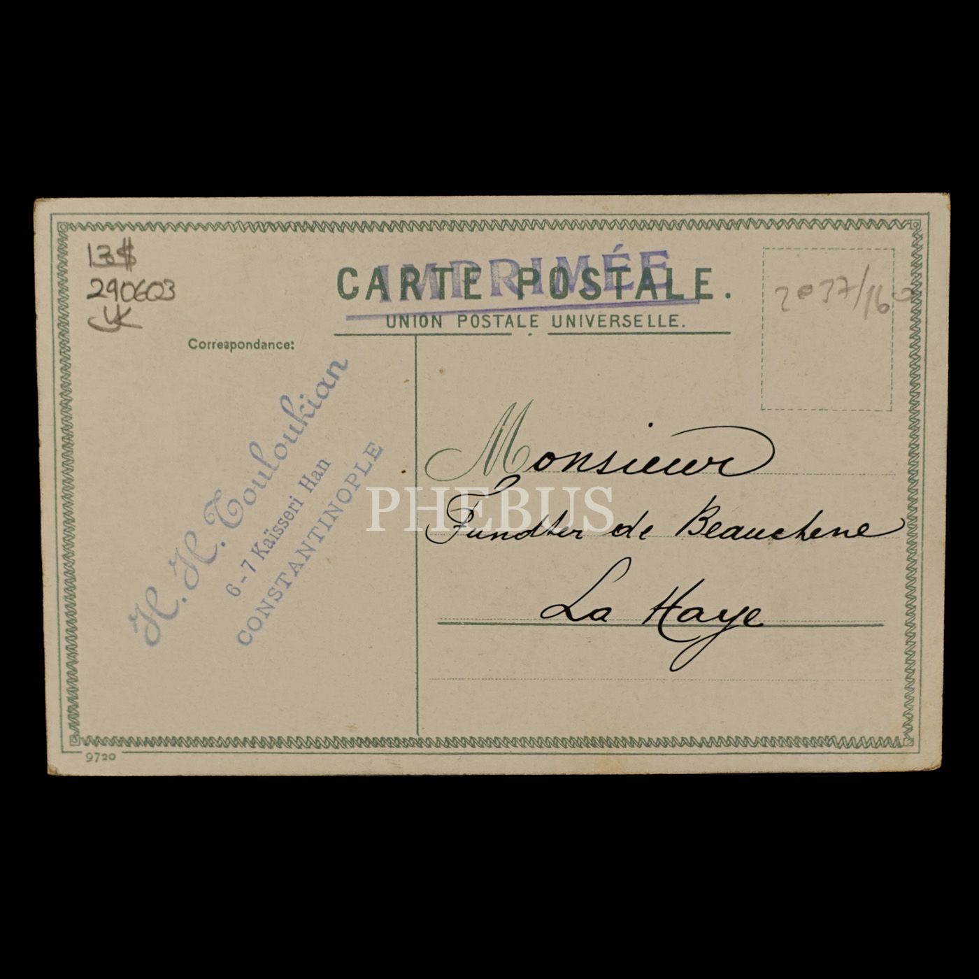 Postadan geçmiş. Arka yüzü "H. H. Gouloukian - Kaisseri Han, Constantinople" damgalı.