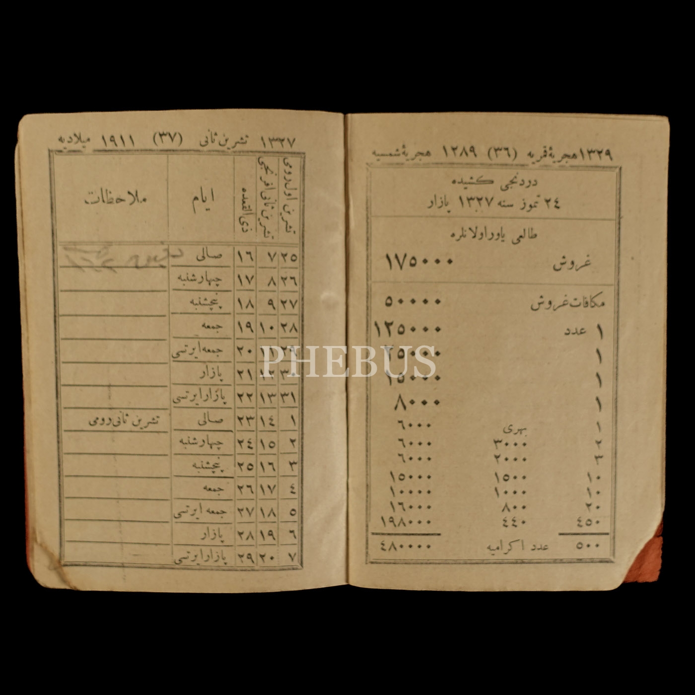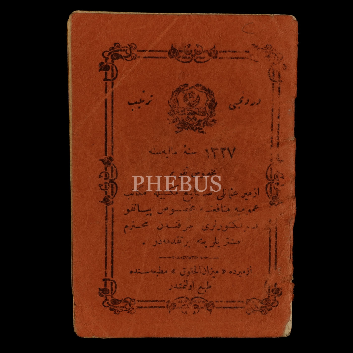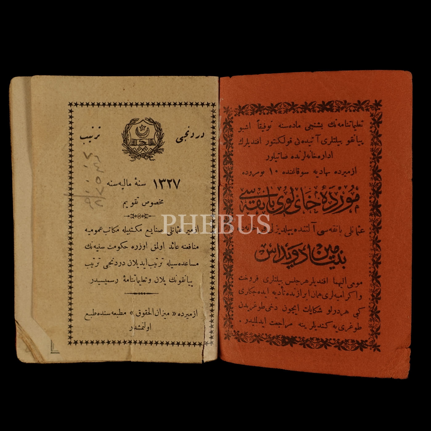 İzmir Osmanlı Sanayi Mektebi yararına satılan 1327 senesine mahsus takvim, İzmir Mizanü´l-Hukuk Matbaası, 8x12 cm...