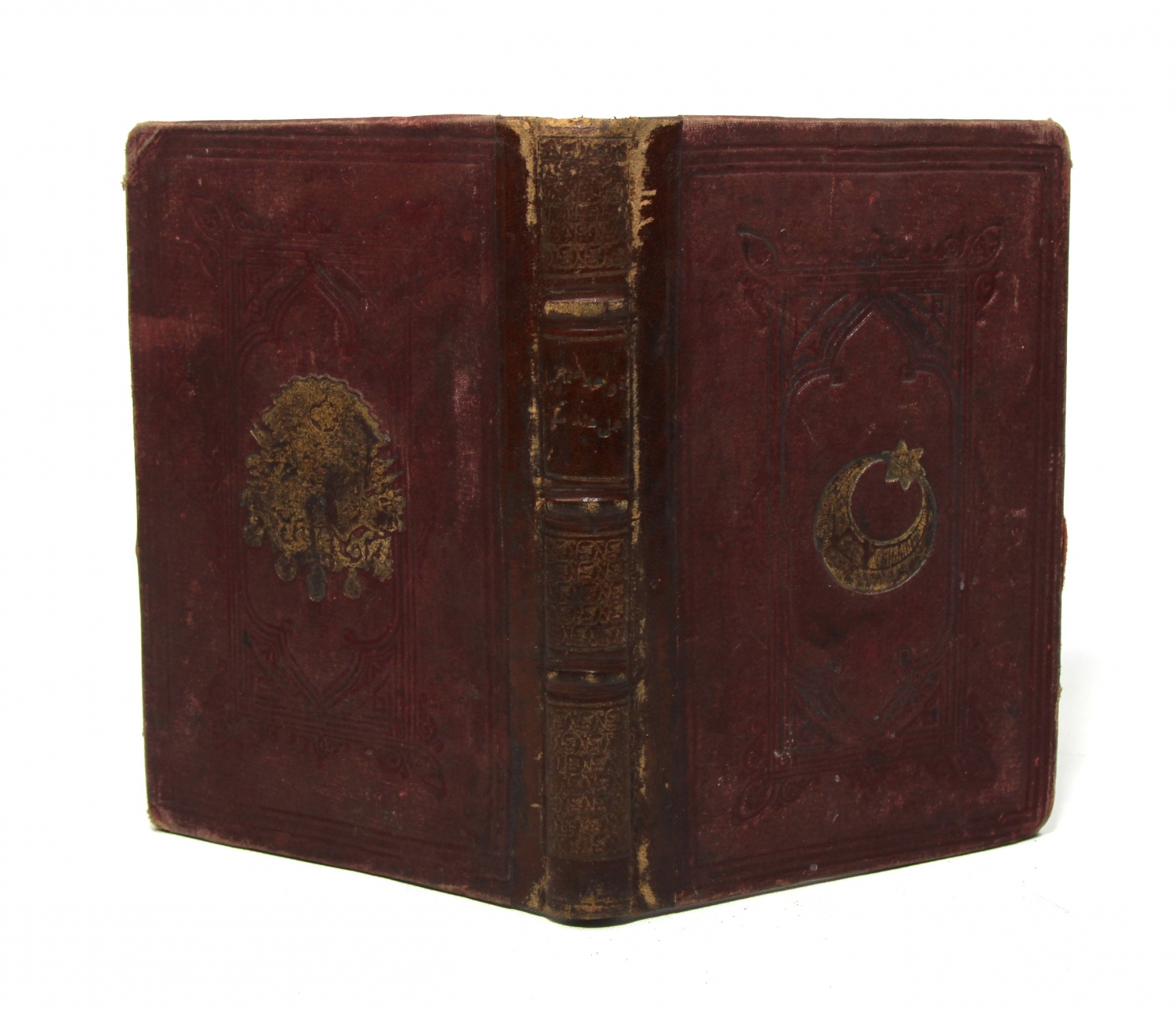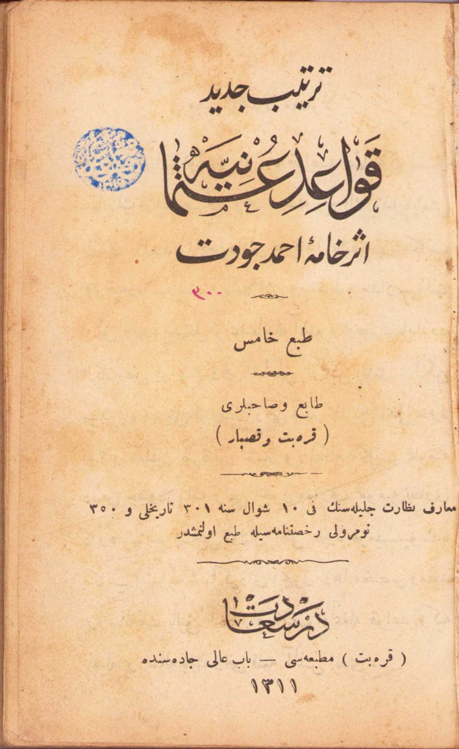 Bir yüzü Osmanlı devlet armalı diğer yüzü ay yıldız ciltte Osmanlıca Tertib-i Cedid Kavaid-i Osmaniye, Ahmet Cevdet, beşinci baskı, Karabet Matbaası, Dersaadet, 1311, resimli,160 sayfa, 11x17 cm, ÖZEGE; 20739