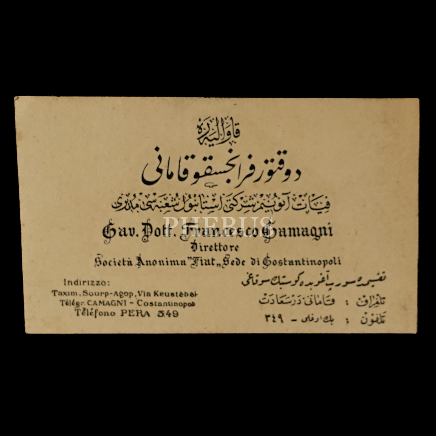 Fiat Anonim Şirketi İstanbul Şubesi Müdürü Francesco Gamagni´nin Osmanlıca ve İtalyanca kartviziti, 10x6 cm...