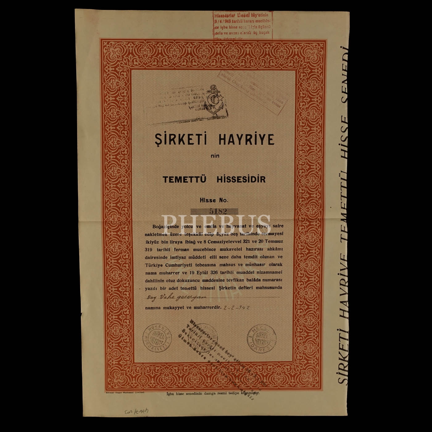 Şirketi Hayriye´nin temettü hissesi, 1942, 26x39 cm...