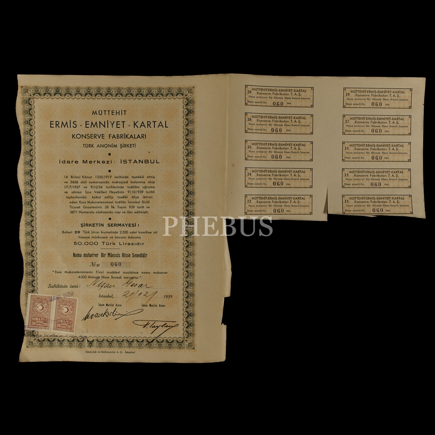 Müttehit Ermis - Emniyet - Kartal Konserve Fabrikaları hisse senedi, 1939, 19x26 cm...