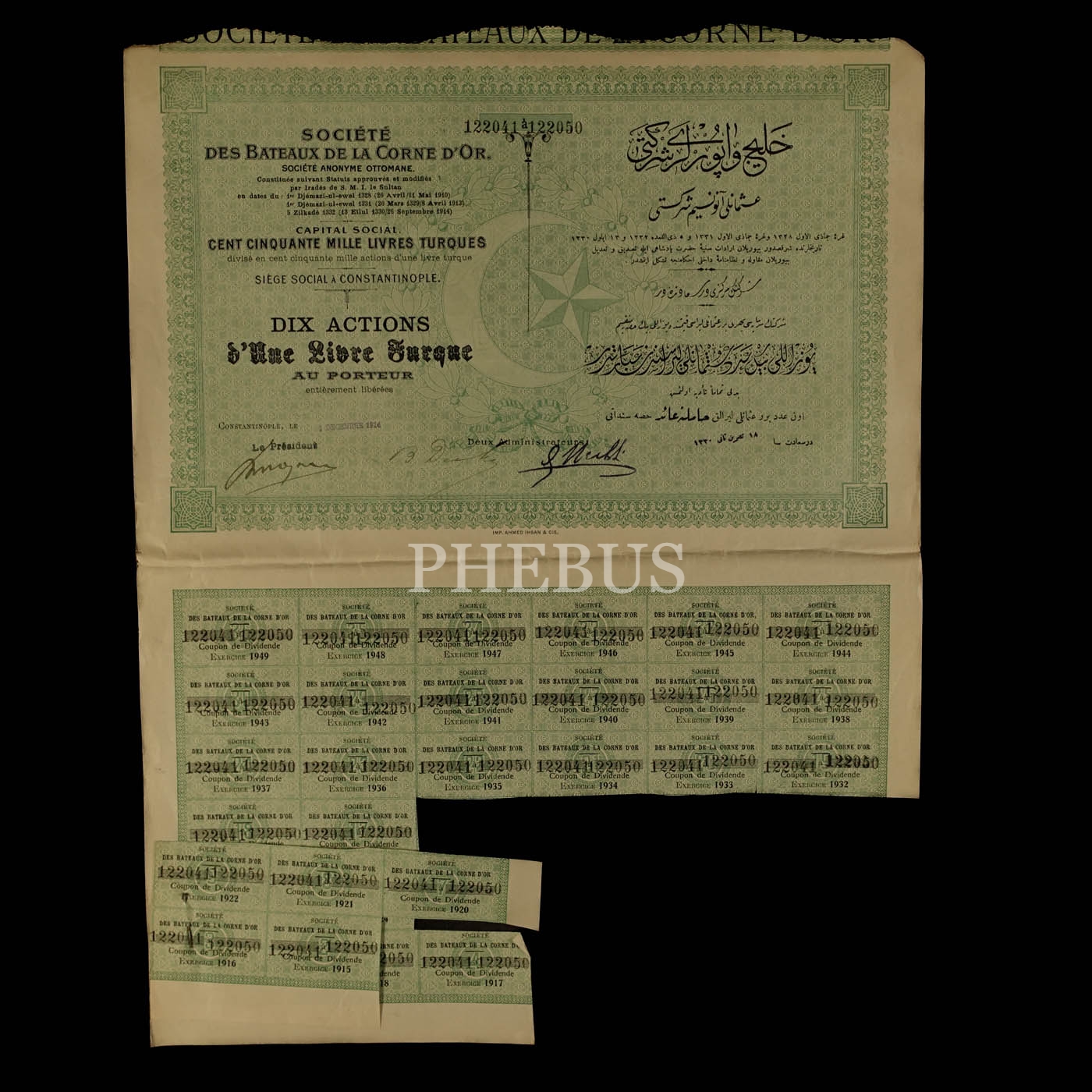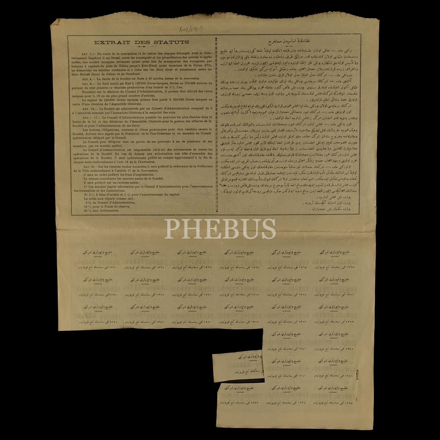 Haliç Vapurları Şirket-i Osmanlı Anonim Şirketi (Societe Des Bateaux De La Corne D´Or Societe Anonyme Ottomane) hisse senedi, 1914, 37x47 cm...