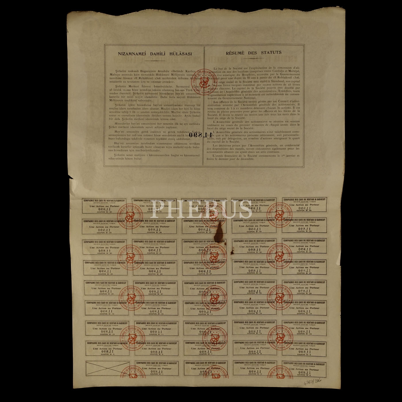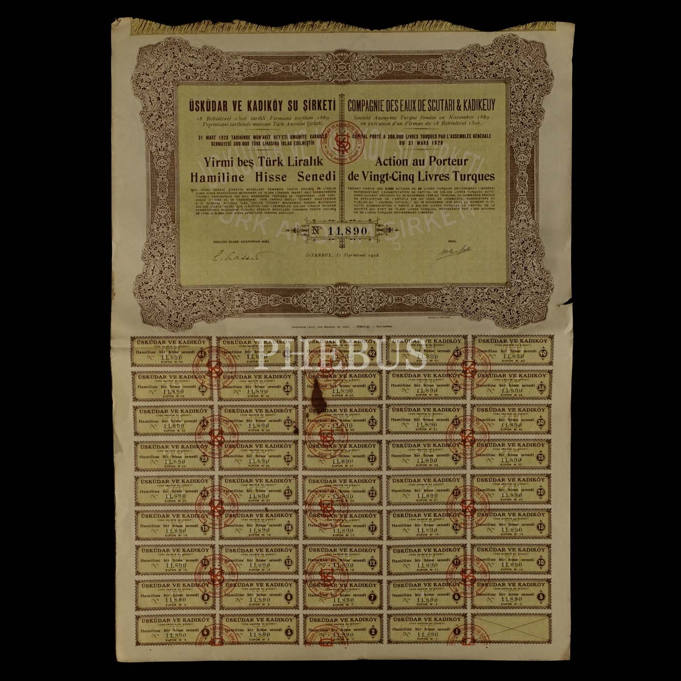 Üsküdar ve Kadıköy Su Şirketi (Compagnie des Eaux de Scutari & Kadikeuy) hamiline hisse senedi, 1928, 35x50 cm...