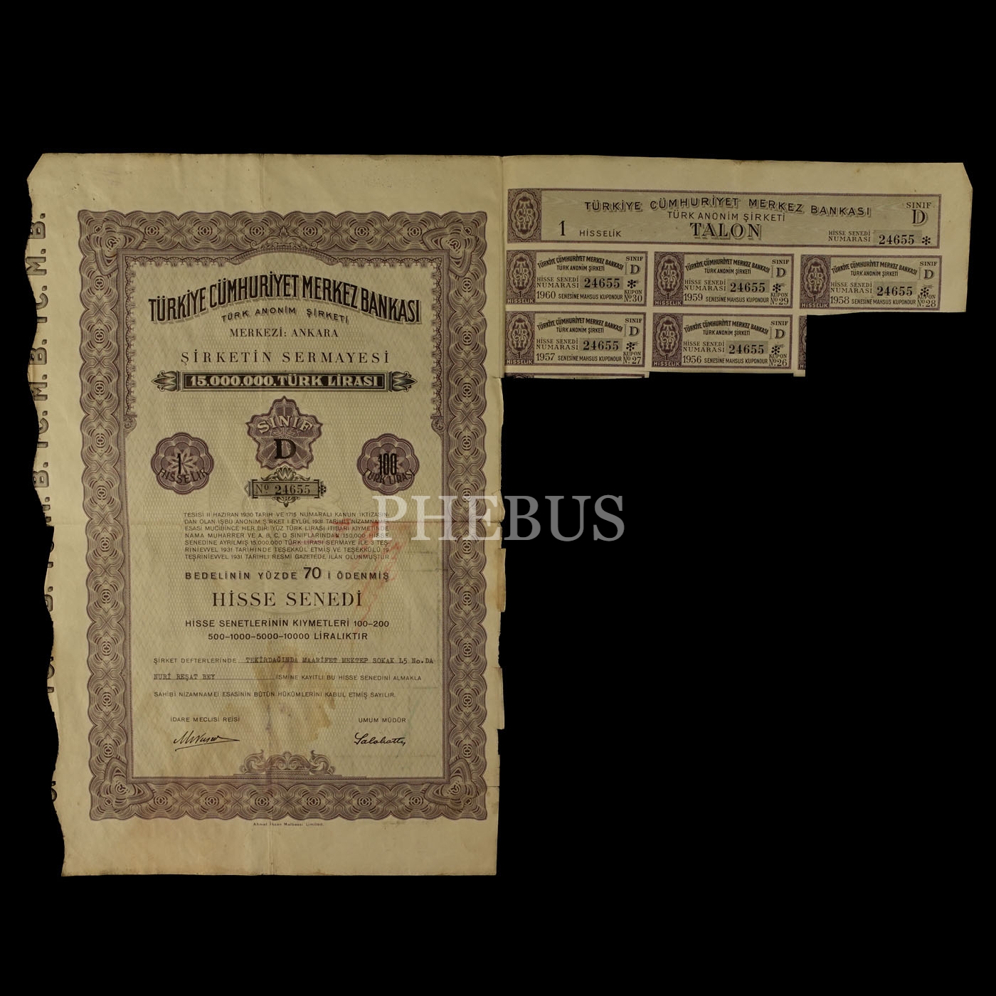 Türkiye Cümhuriyet Merkez Bankası Türk Anonim Şirketi hisse senedi, 1931, 24x38 cm...