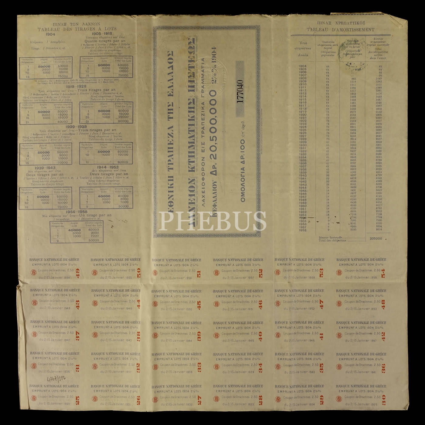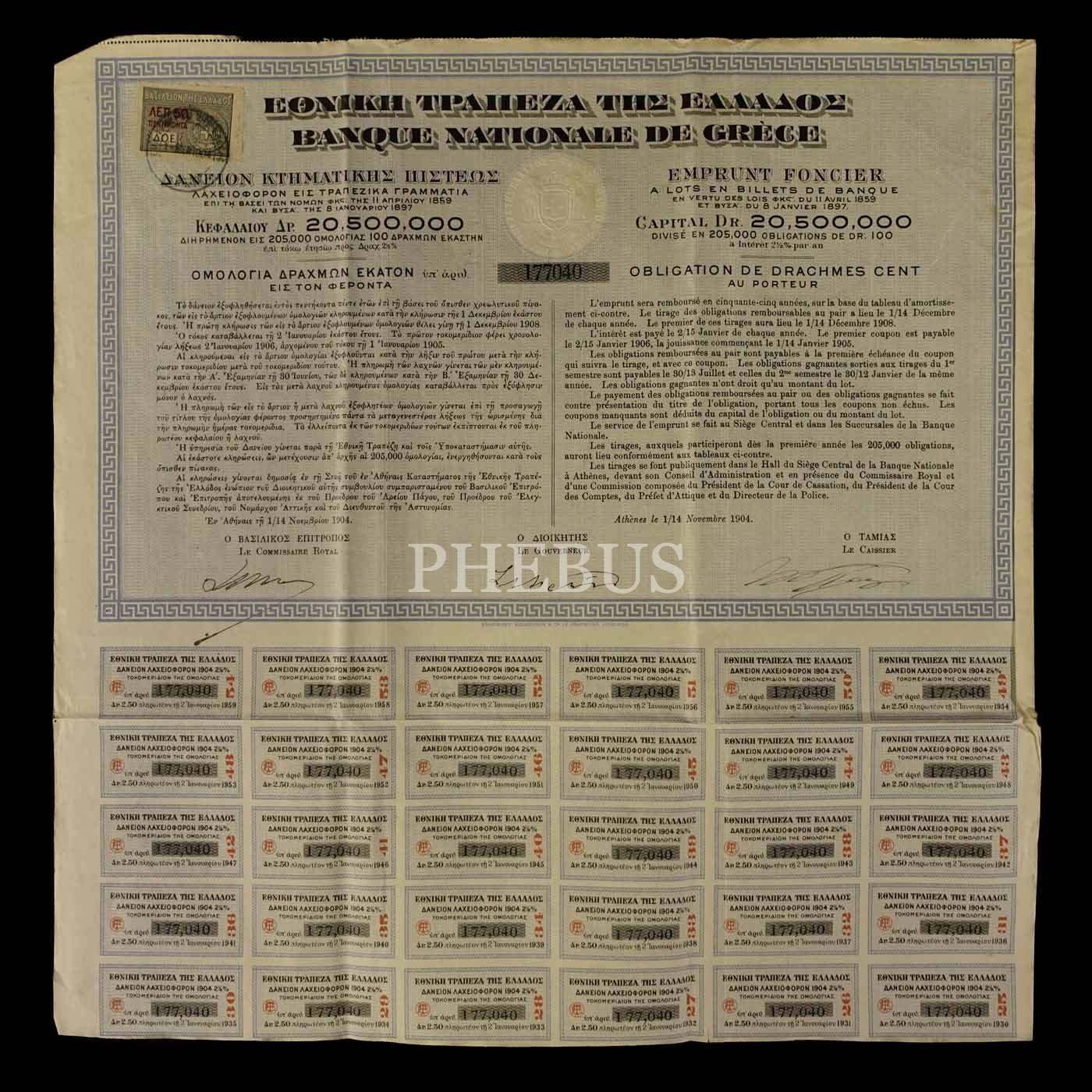 Yunan Merkez Bankası (Banque Nationale de Grece) borçlanma senedi, 1904 tarihli, 36x36 cm...