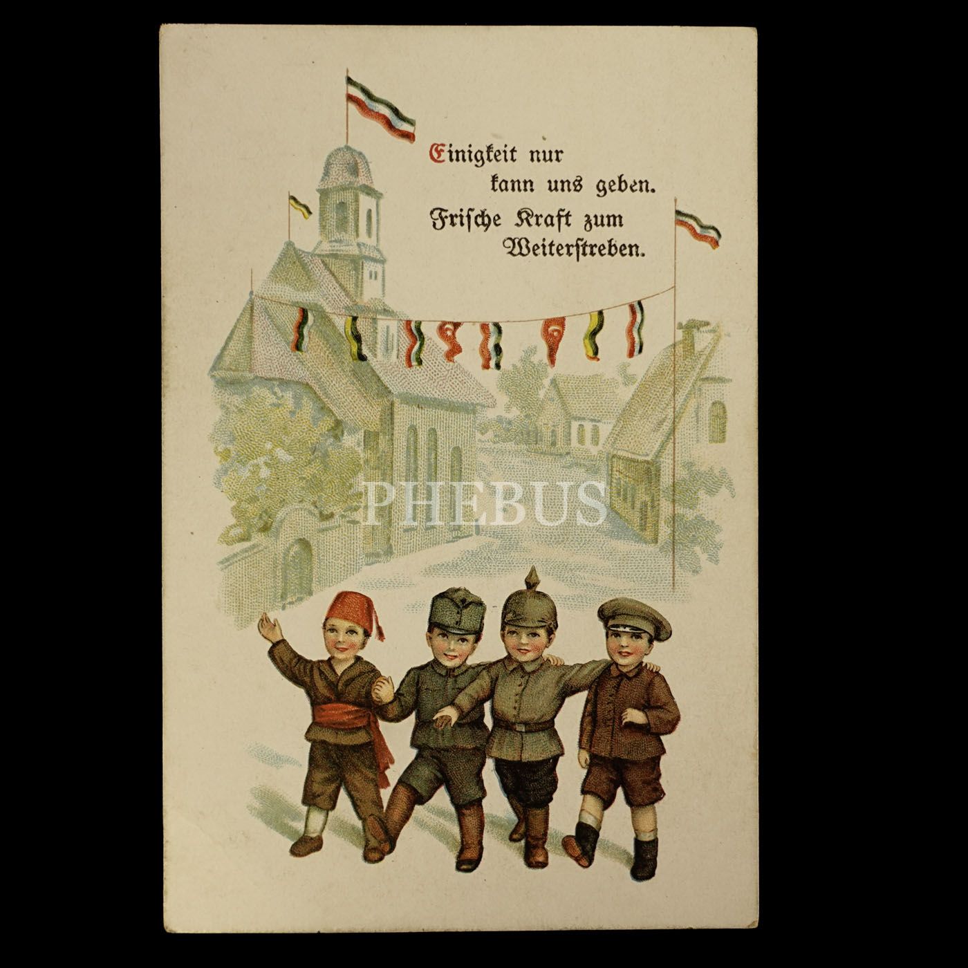 Müttefik devletleri temsil eden çocuklar ve bayraklar görselli, birlik ve beraberlik mesajı içeren Almanca yazılı İttifak kartpostalı, 9x14 cm...