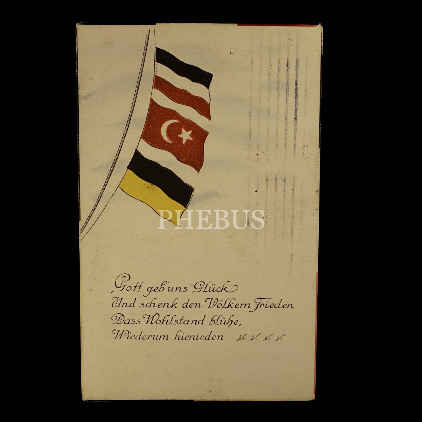 Müttefik devletlerin bayrakları görselli ve Tanrı´dan mutluluk, huzur ve refah dileyen Almanca şiirli gofre İttifak kartpostalı, 9x14 cm...