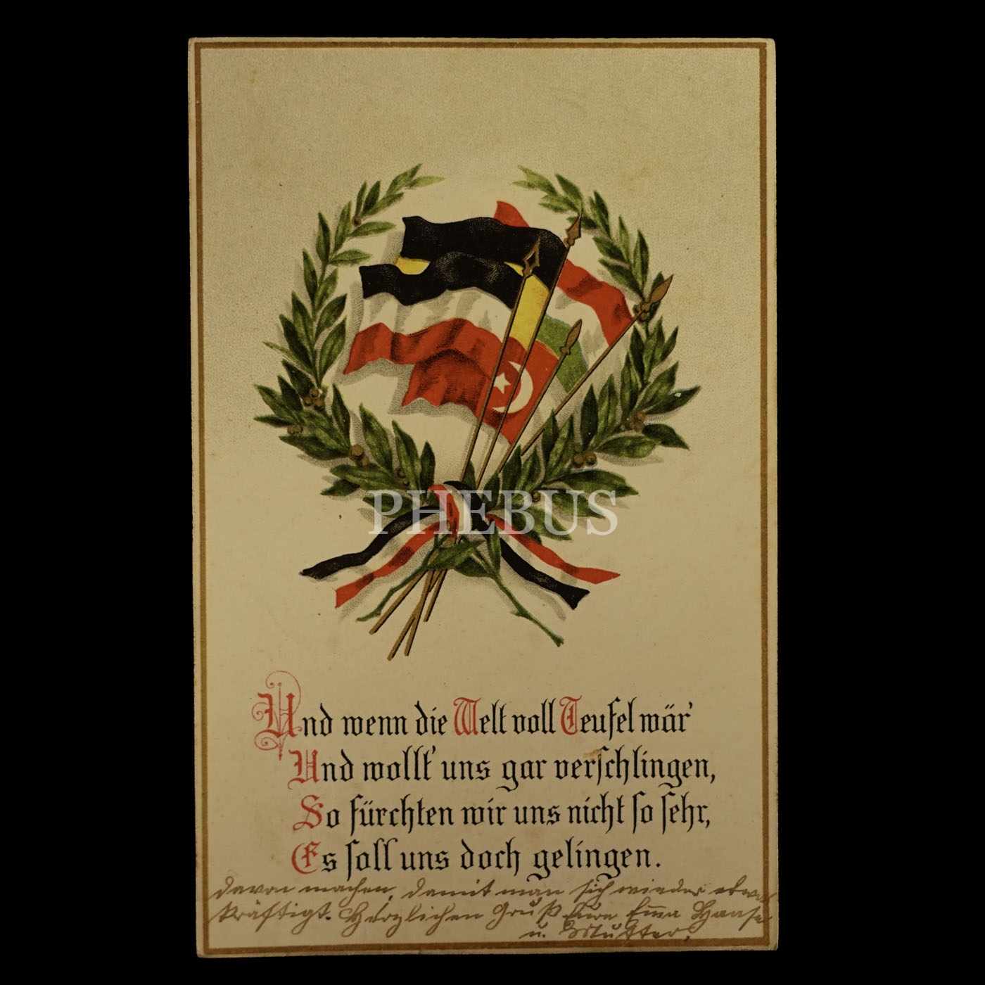 Müttefik devletlerin bayrakları görselli ve "başaracağız" mesajı içeren Almanca yazılı İttifak kartpostalı, 9x14 cm...