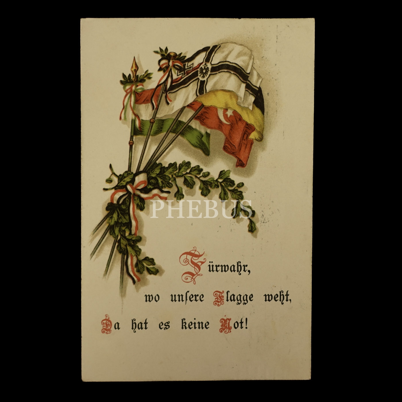 Müttefik devletlerin bayrakları görselli ve bayrakları yücelten Almanca metin yazılı İttifak kartpostalı, 9x14 cm...