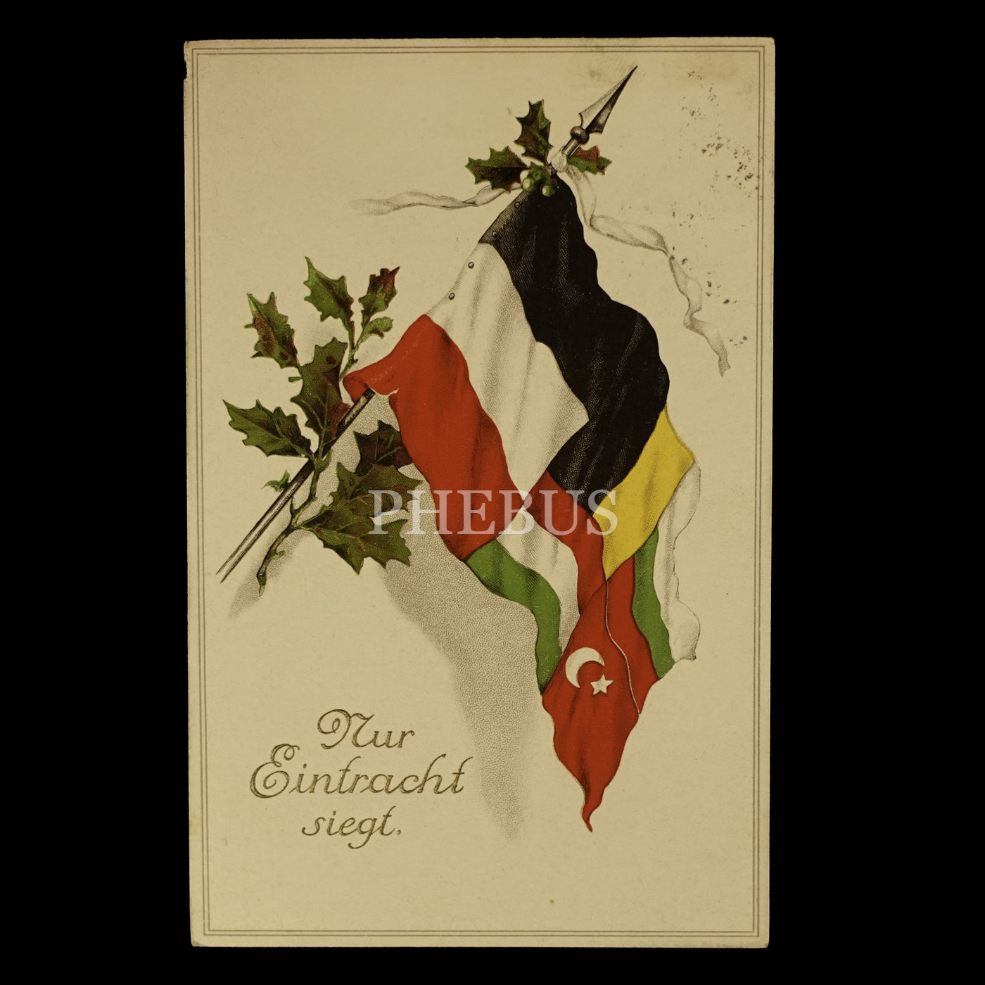 Müttefik devletlerin bayrakları görselli ve Almanca "Yalnızca birlik kazanır!" yazılı gofre İttifak kartpostalı, 9x14 cm...