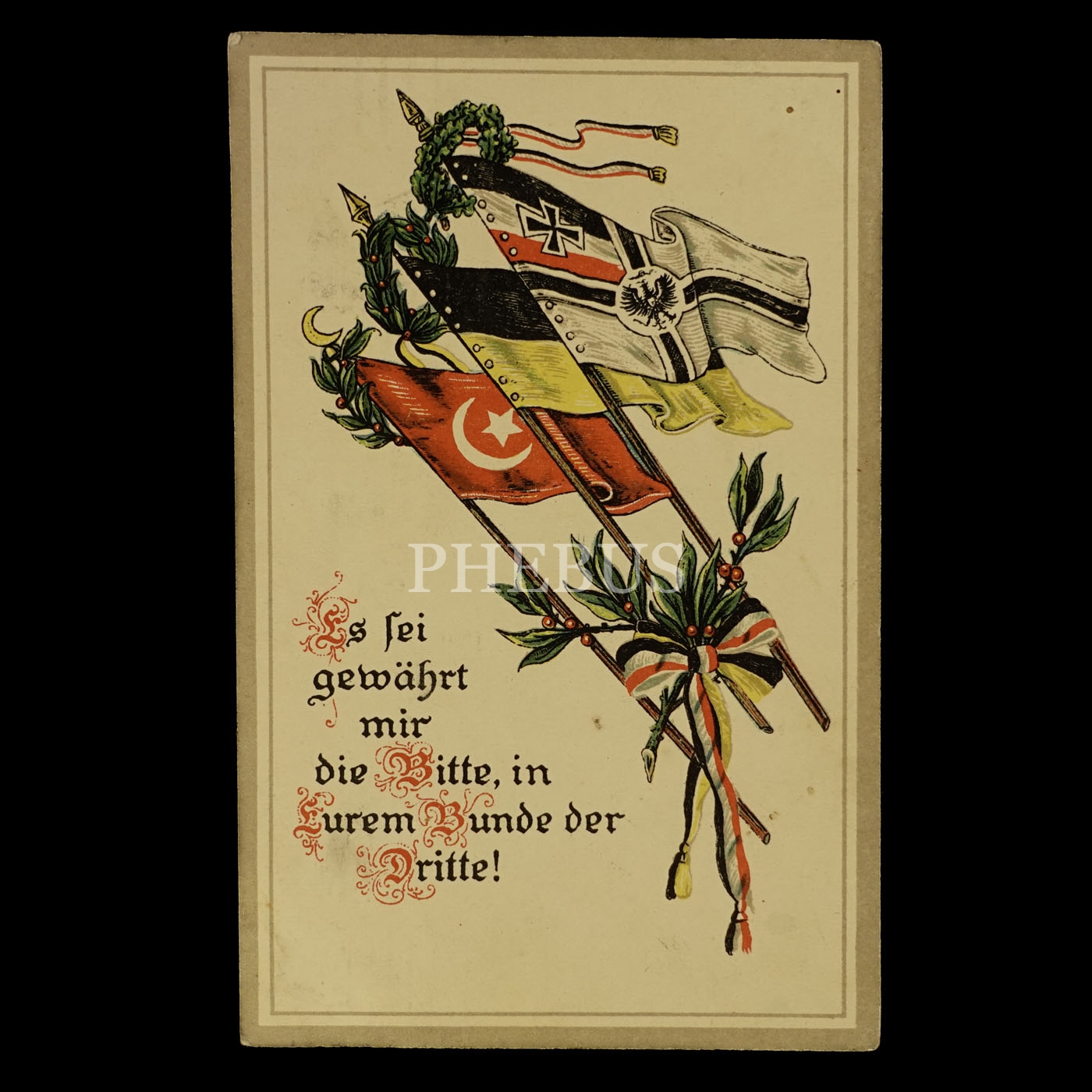 Müttefik devletlerin bayrakları görselli ve birlik mesajı içeren Almanca yazılı İttifak kartpostalı, 9x14 cm...