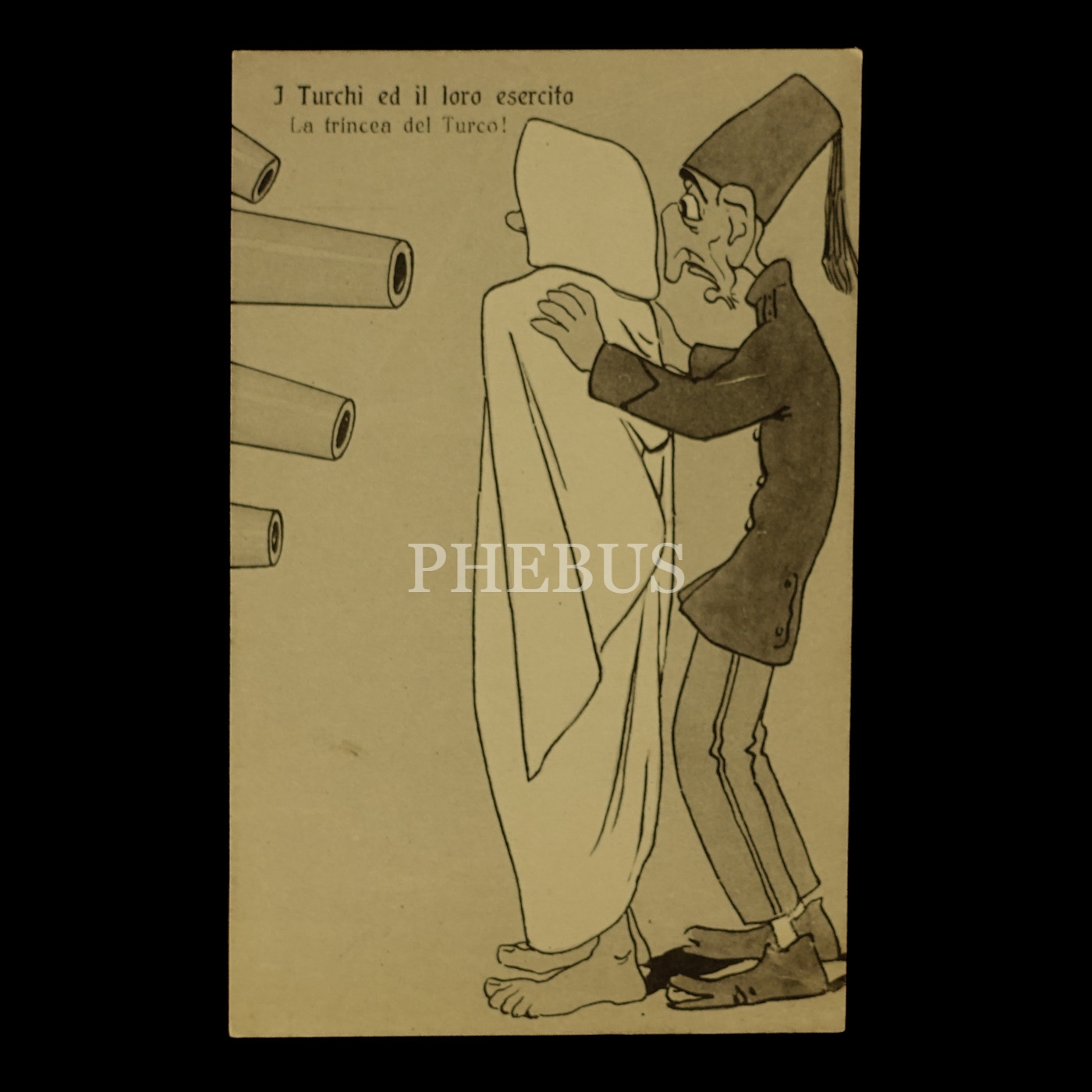 İtalyanca "Türkler ve Orduları: Türkün hendeği" başlıklı, Türklerin savaşta kendilerine kadınları siper ettiğini iddia eden propaganda kartpostalı, 9x14 cm...
