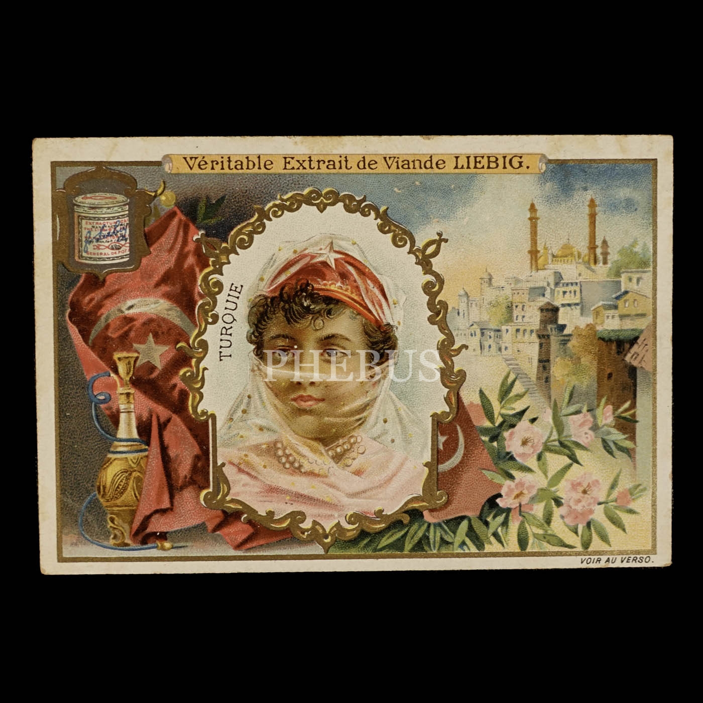 Türk bayrağı ve Türk kadını görselli Liebig et suyu kartı, 11x7 cm...