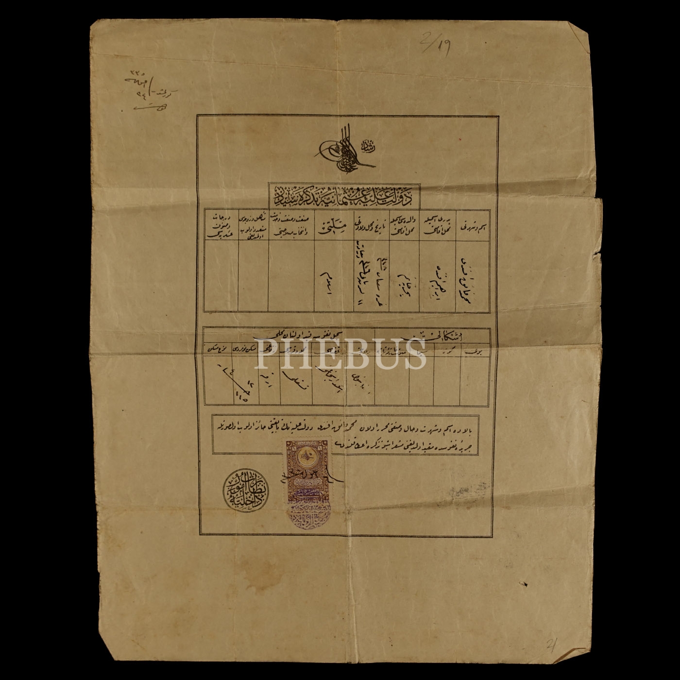 Mehmed Faik Efendi adına düzenlenmiş, Sultan Mehmed Reşat tuğralı, Osmanlı devleti nüfus kayıt evrakı, 6 Eylül 1330, 28x36 cm...