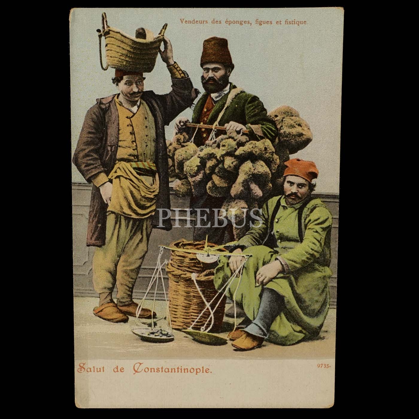Sünger, incir ve fıstık satıcıları, "Vendeurs des eponges, figues et fistique - Constantinople", 9x14 cm...