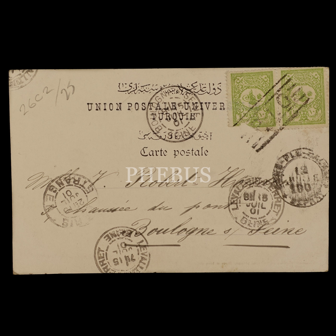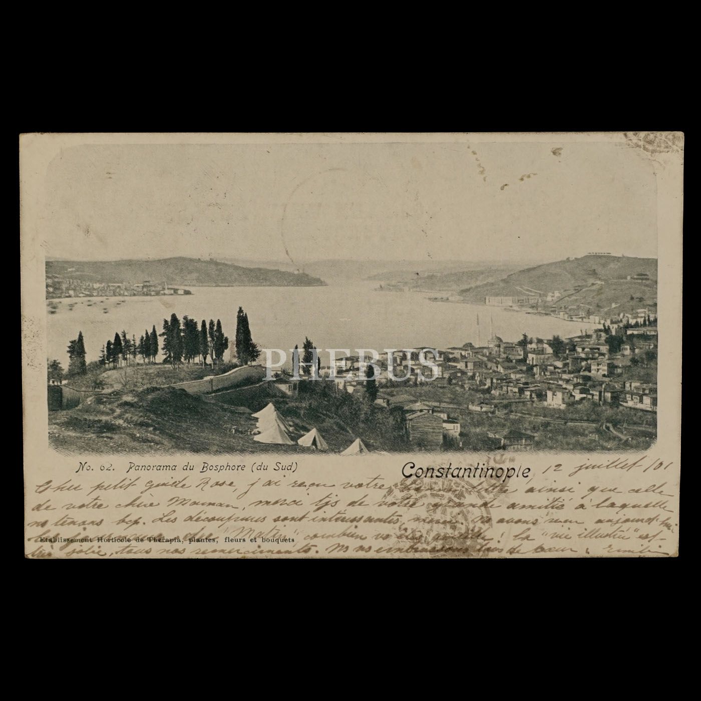Güney istikametinden alınmış bir Boğaziçi panoraması, "Panorama du Bosphore (du Sud) - Constantinople", ed. Etablissement Horticole de Therapia, 14x9 cm...