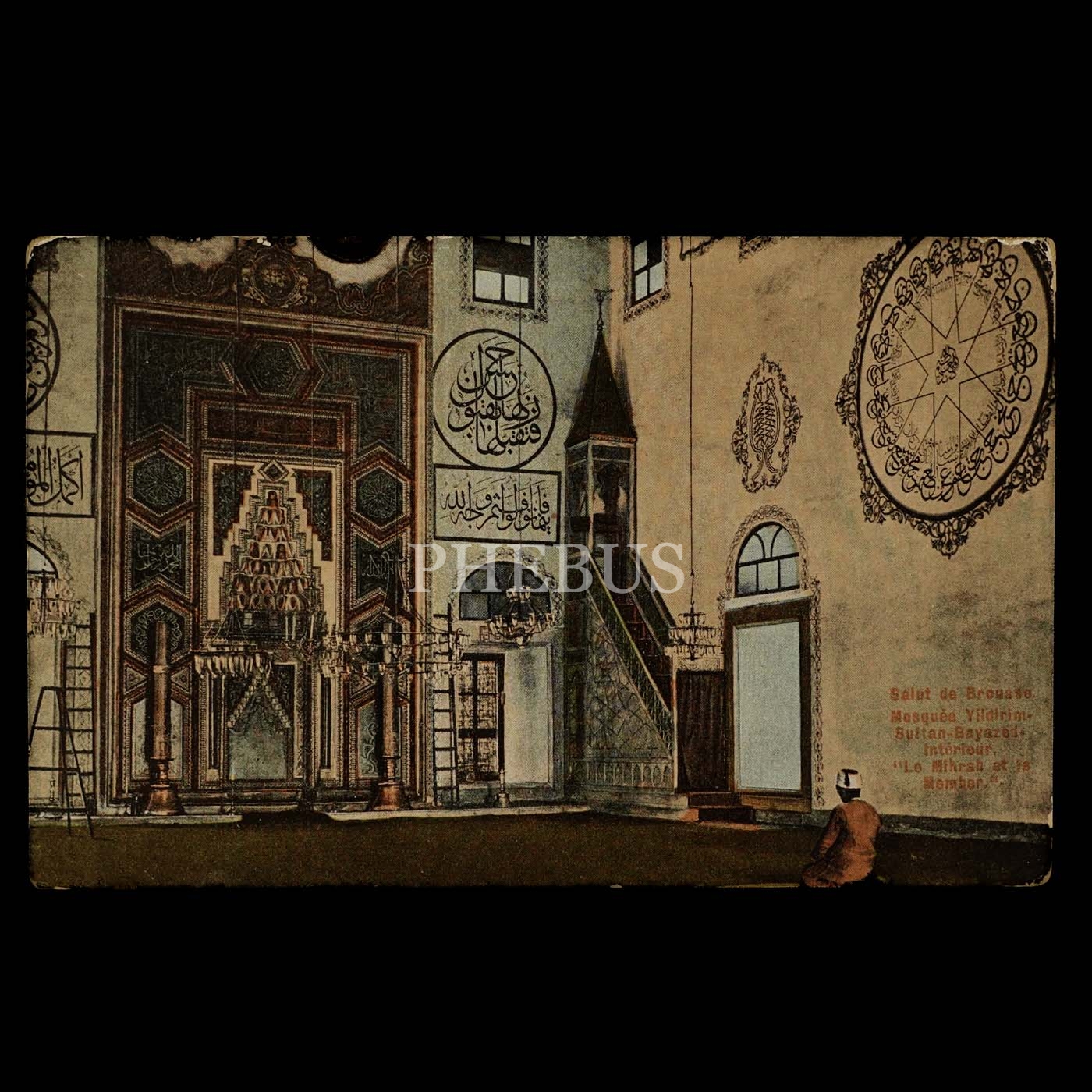 Yıldırım Bayezid Camii´nin içinden görünüm, Bursa, "Salut de Brousse - Mosquee Yildirim Sultan Bayazed Interieur (Le Mihrab et le Member", 14x9 cm...