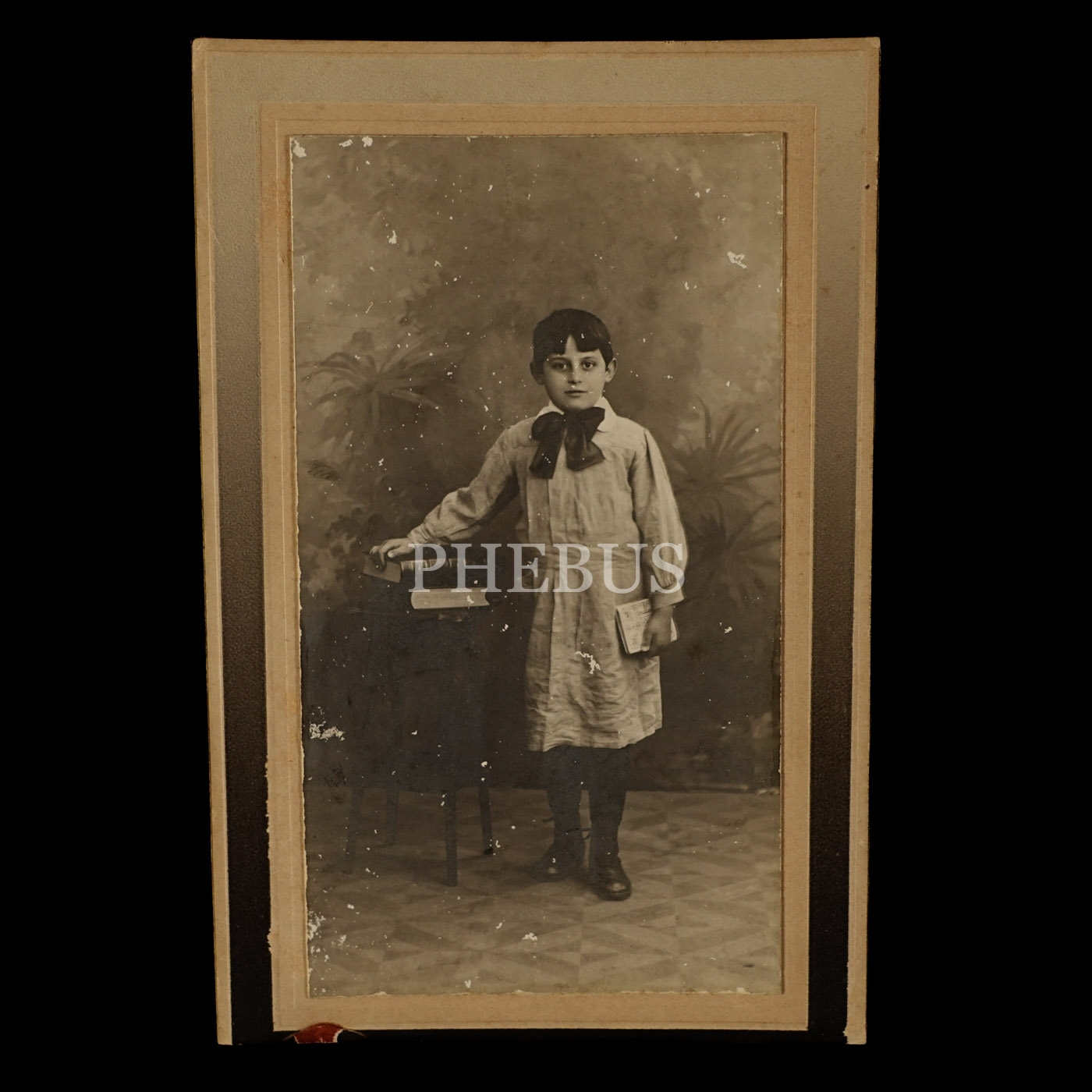 Minik öğrencinin kitaplarıyla birlikte aldırdığı stüdyo hatıra kabin fotoğrafı, 11x16 cm...