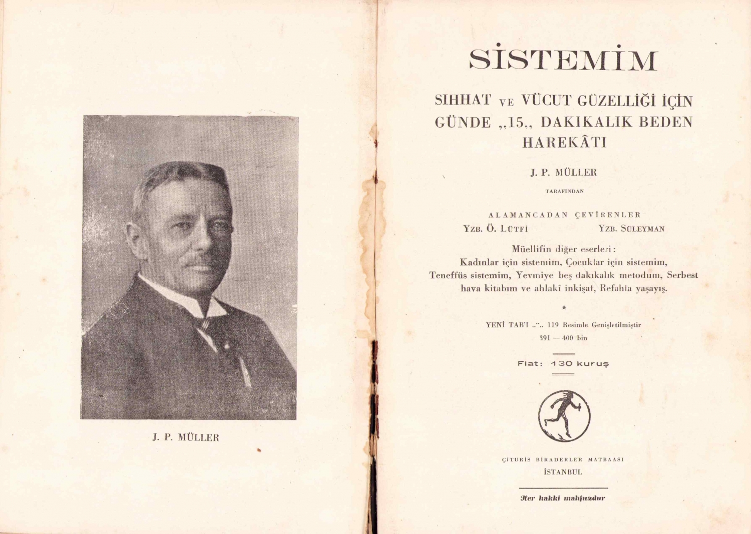 Sistemim - sıhhat ve vücut güzelliği için günde 15 dakikalık beden harekatı, I. P. Müller, çev., Ö. Lütfi, Çituri Biraderler Matbaası, İstanbul