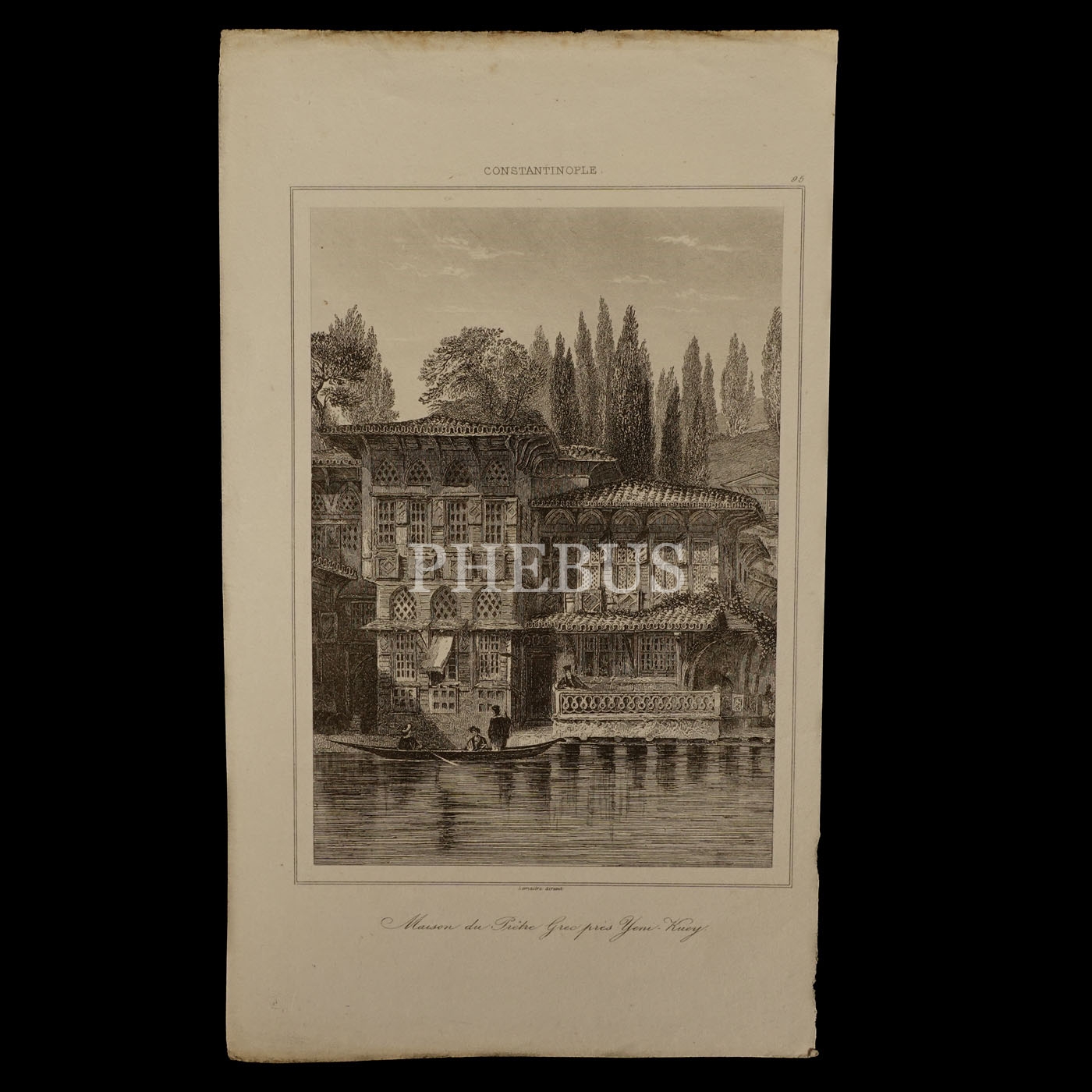 Joseph Marie Jouannin´in kaleme aldığı ve gravürlerini Jules Van Gaver´ın çizdiği, "Histoire et Description de tous les Peoples Turquie" adlı eserden çıkma Yeniköy´de bir yalı gravürü, 21x13 cm...
