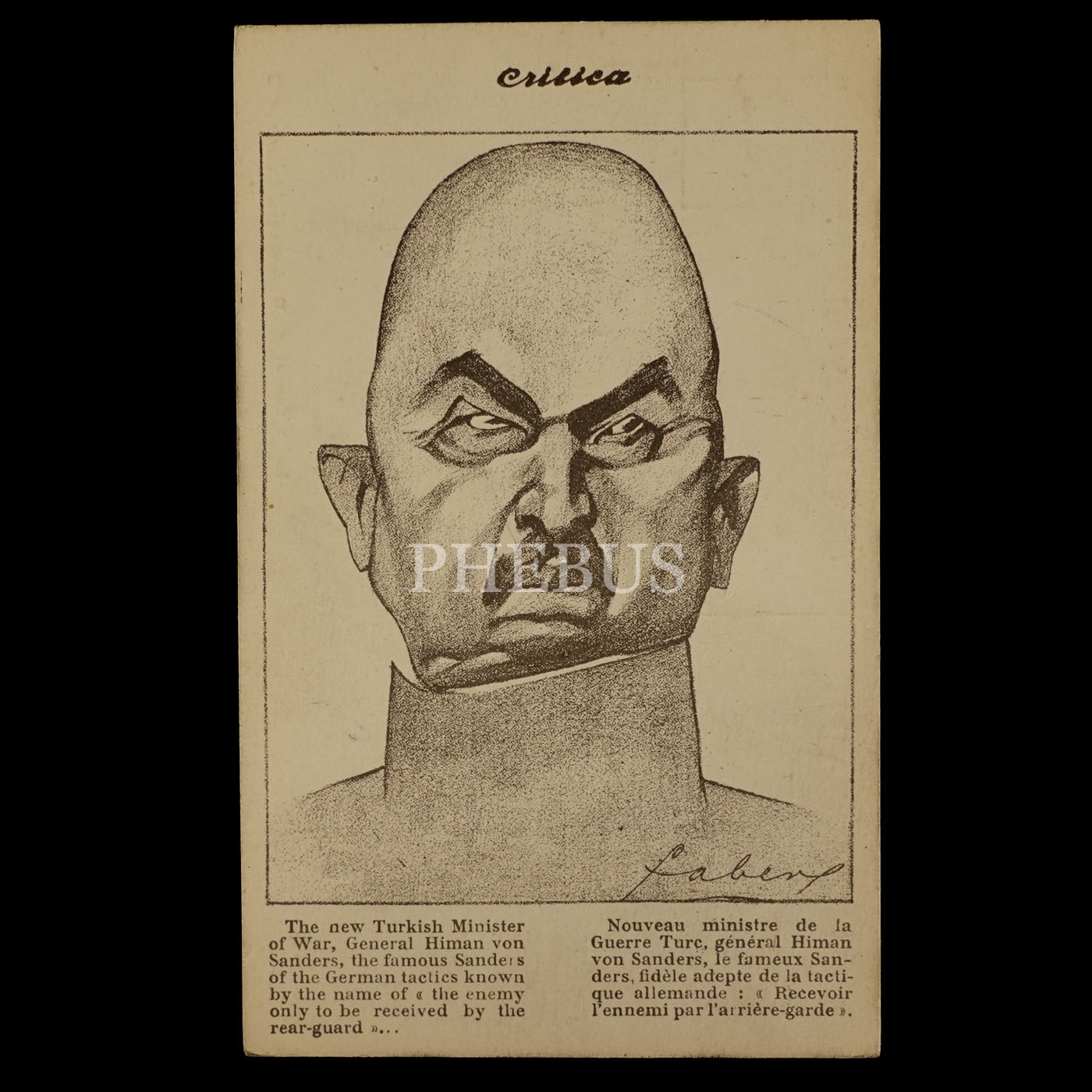 Liman Von Sander´in, karikatüristik bir çizimle resmedildiği ve savaş taktikleriyle alay edildiği propaganda kartpostalı, 14x9 cm...