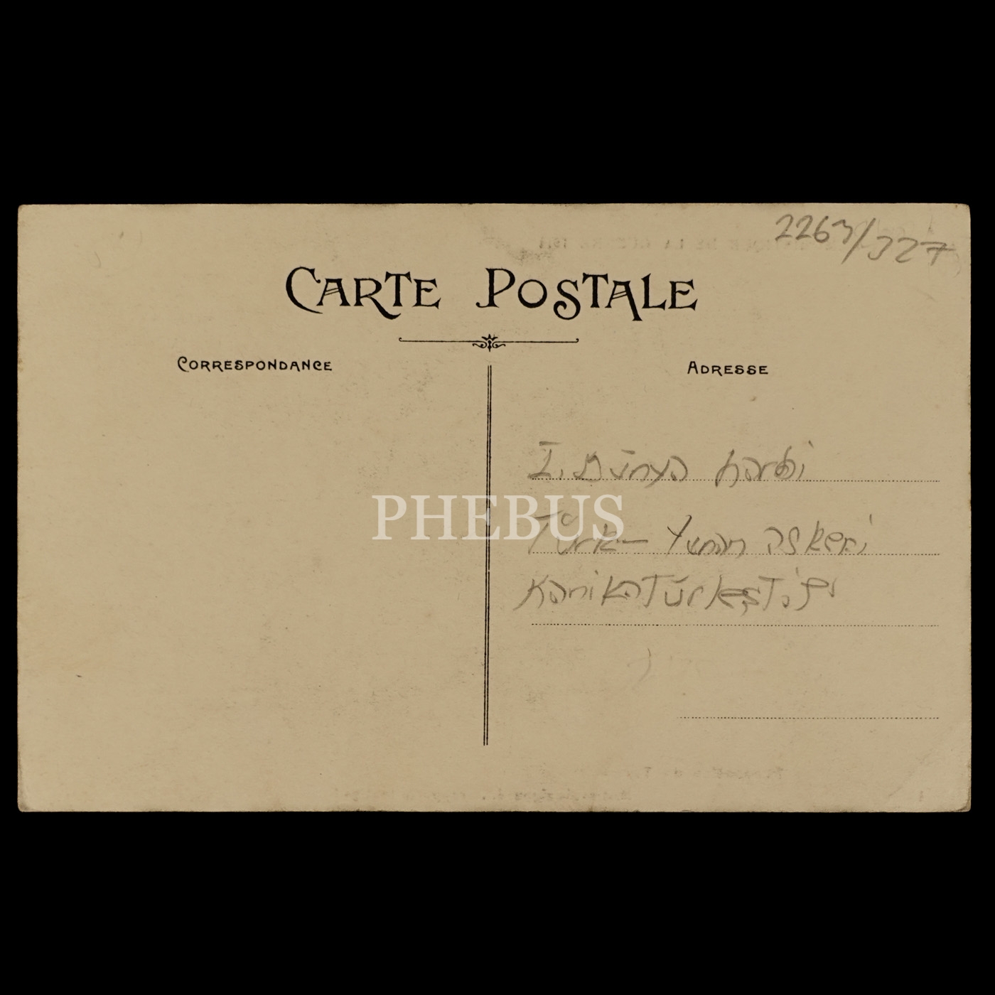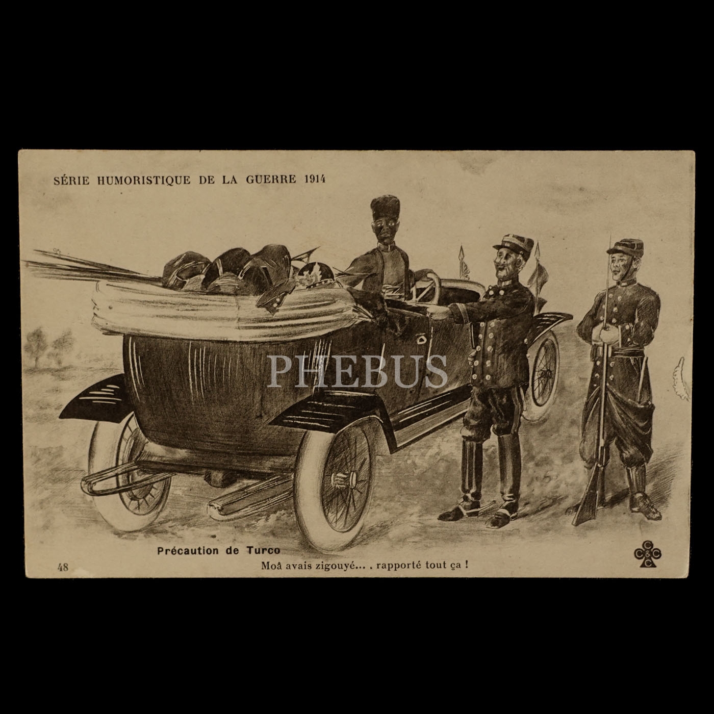 Birinci Cihan Harbi´nde Türk ve Yunan askeri arasında geçen bir diyaloğun karikatürleştirilerek resmedildiği kartpostal, "Serie Humorostique De La Guerre 1914, Precaution de Turco", 14x9 cm...
