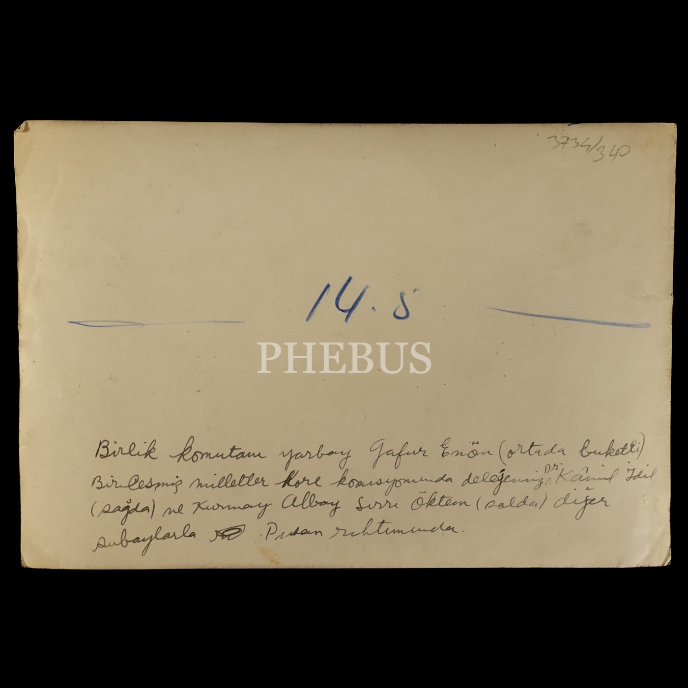 Türkiye Cumhuriyeti´nin Güney Kore nezdindeki ilk Büyükelçisi Kamil İdil, Yarbay Gafur Enön ve Kurmay Albay Sırrı Ökten´in Busan Limanı´nda karşılandıkları sırada alınmış hatıra fotoğraf, 26x18 cm...