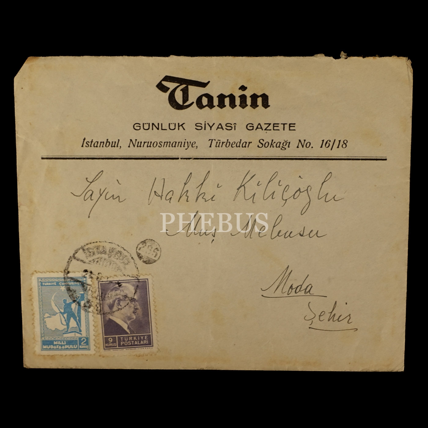 Hüseyin Cahit Yalçın tarafından Muş Milletvekili Hakkı Kılıçoğlu´na gönderilen, Tanin gazetesi antetli zarf içerisinde mektup, 15x12 cm...