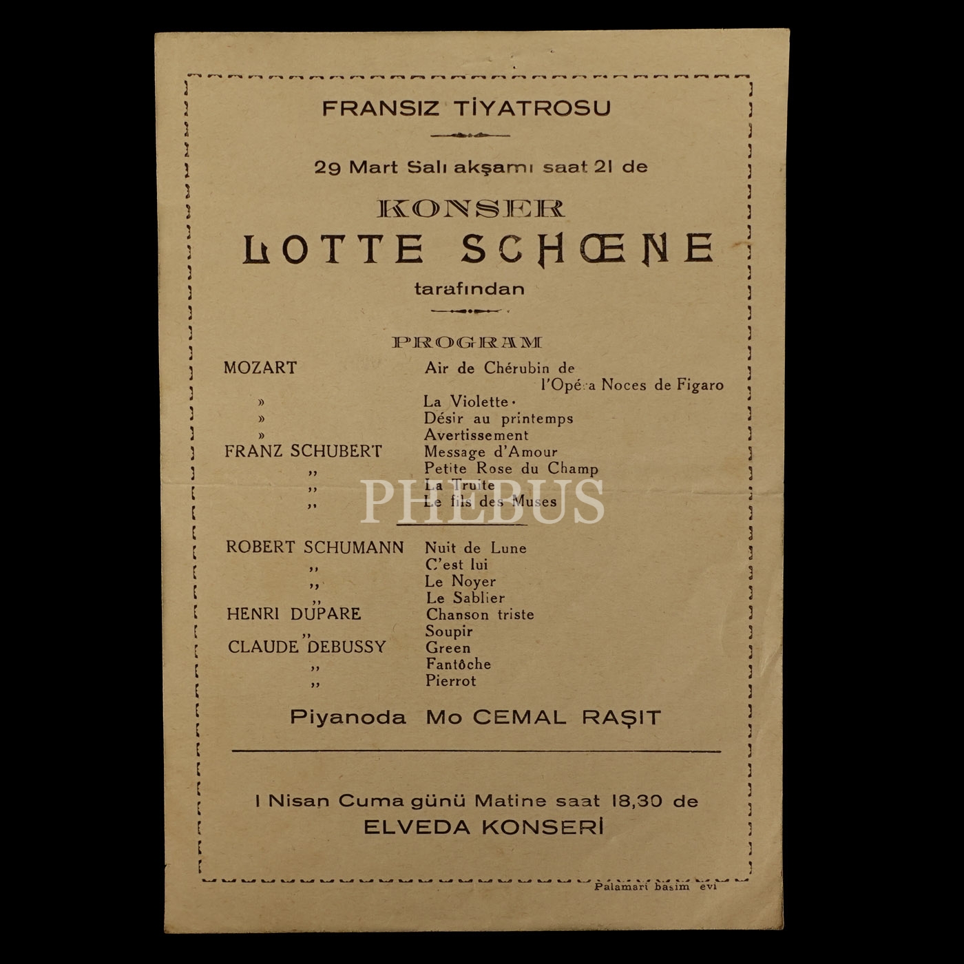 Fransız Tiyatrosu Lotte Schone tarafından düzenlenen konserin afişi, 14x20 cm...