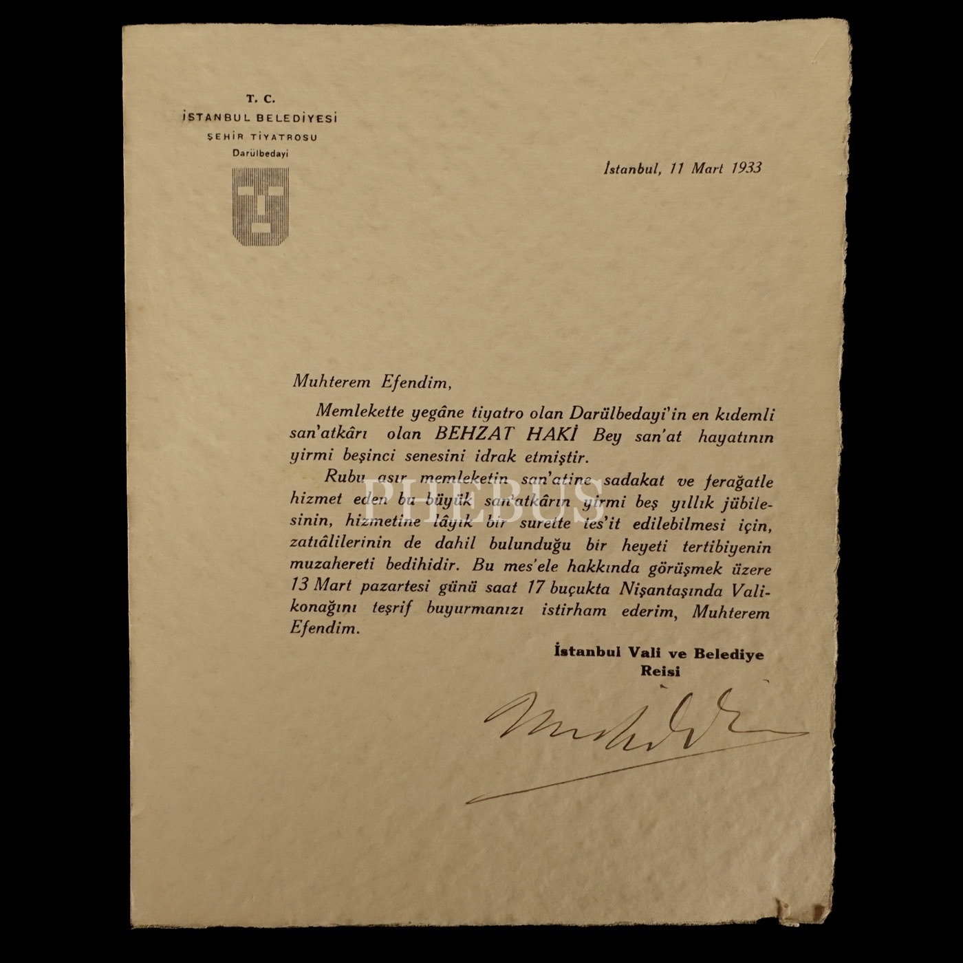 Darülbedayi´nin ilk katılımcılarından, oyuncu Behzat Haki (Butak)´nin jübilesi için görüşmek üzere kaleme alınmış, İstanbul Valisi Muhittin Üstündağ´ın ıslak imzasını taşıyan, T.C. İstanbul Belediyesi ŞehirTiyatrosu Darülbedayi antetli davetiye, 11 Mart 1933, 15x19 cm...