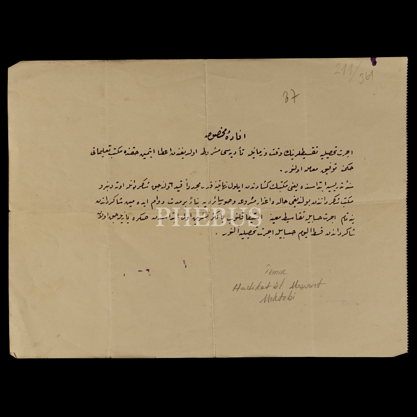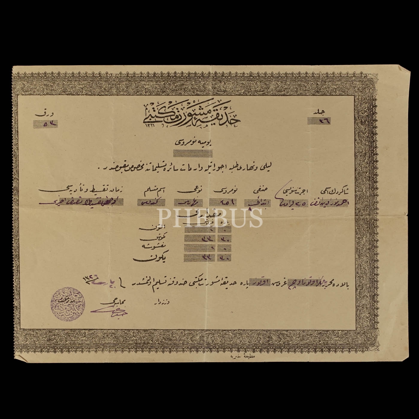 Hadika-i Meşveret Mektebi tarafından Ahmet Nureddin Efendi adına düzenlenen makbuz, 1326, 24x18 cm...