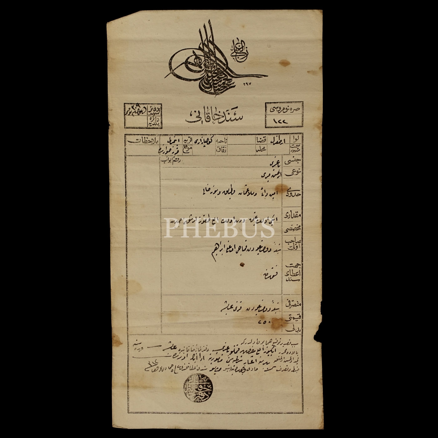Abbas Efendi´nin Eruğrul Livası (Bilecik) Gölpazarı´nda bulunan bağının tapusu, 1312, 17x36 cm...