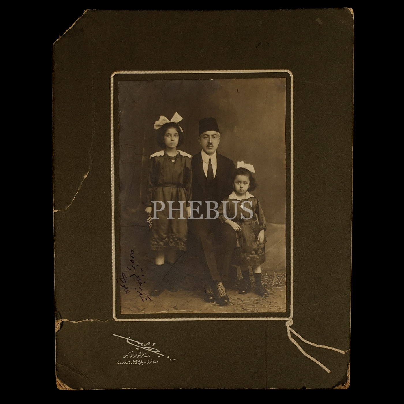 Baba ve iki kızının stüdyo hatıra fotoğrafı, Resne Fotoğrafhanesi, 22x28 cm...