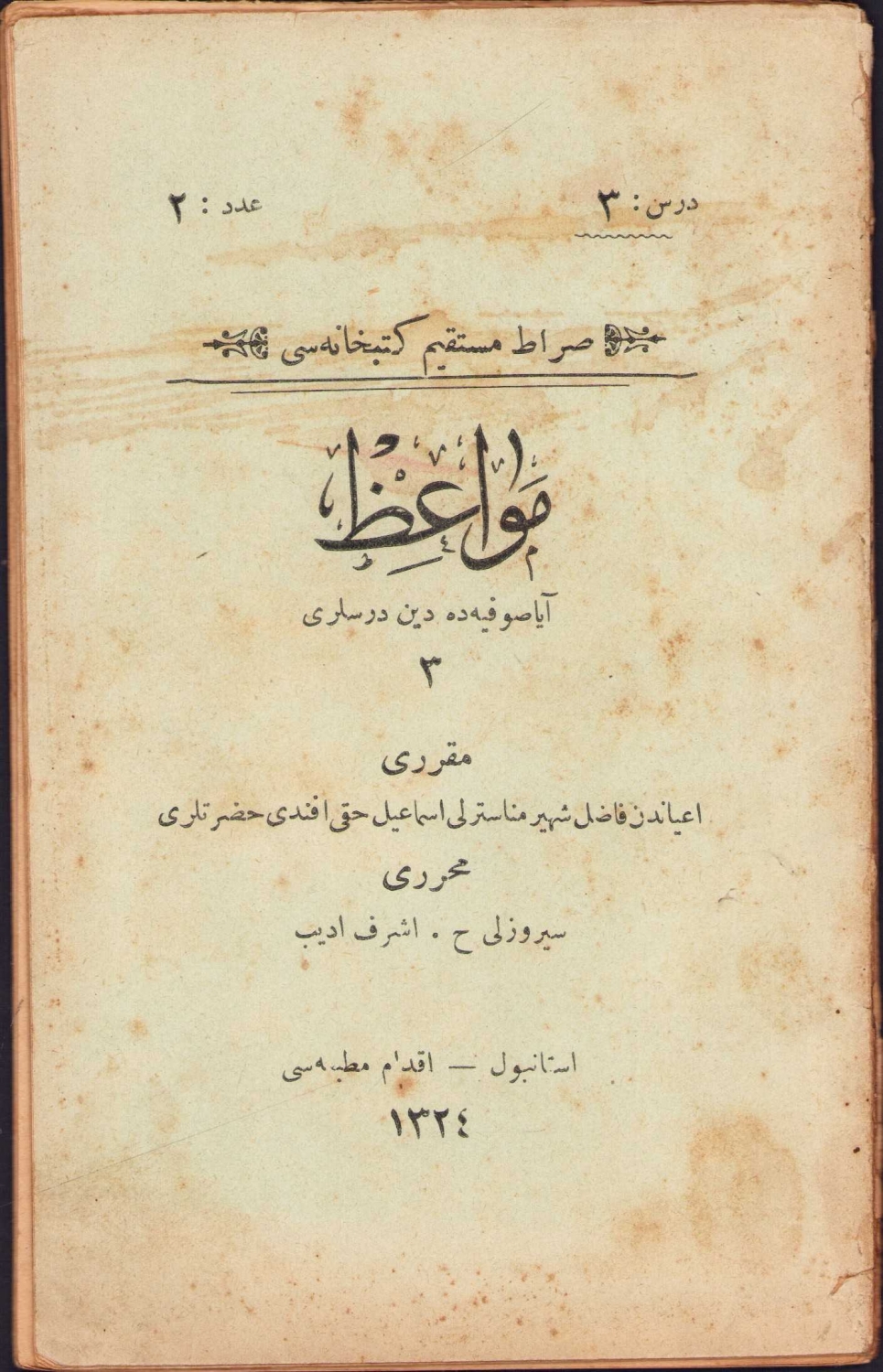 Osmanlıca Mevaiz - Ayasofya'da Din Dersleri 3, Manastırlı İsmail Hakkı, çev., Eşref Edip, İkdam Matbaası, İstanbul, 1324,