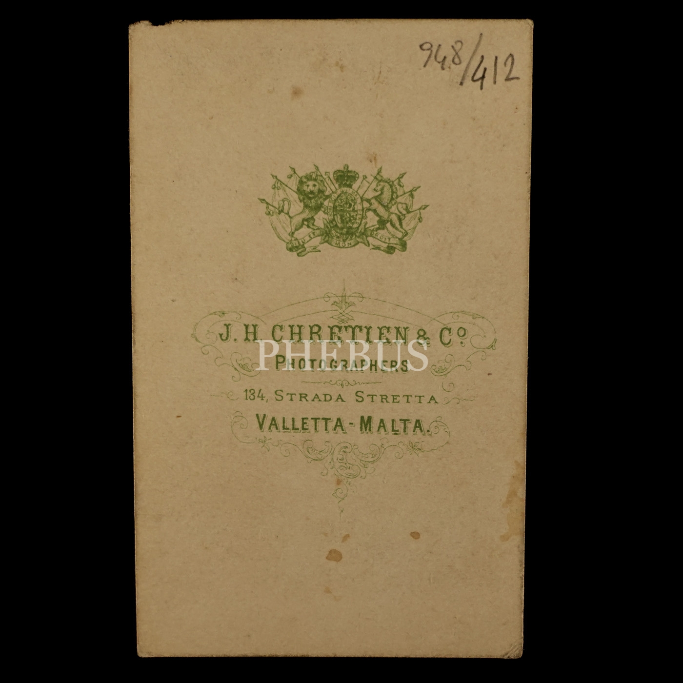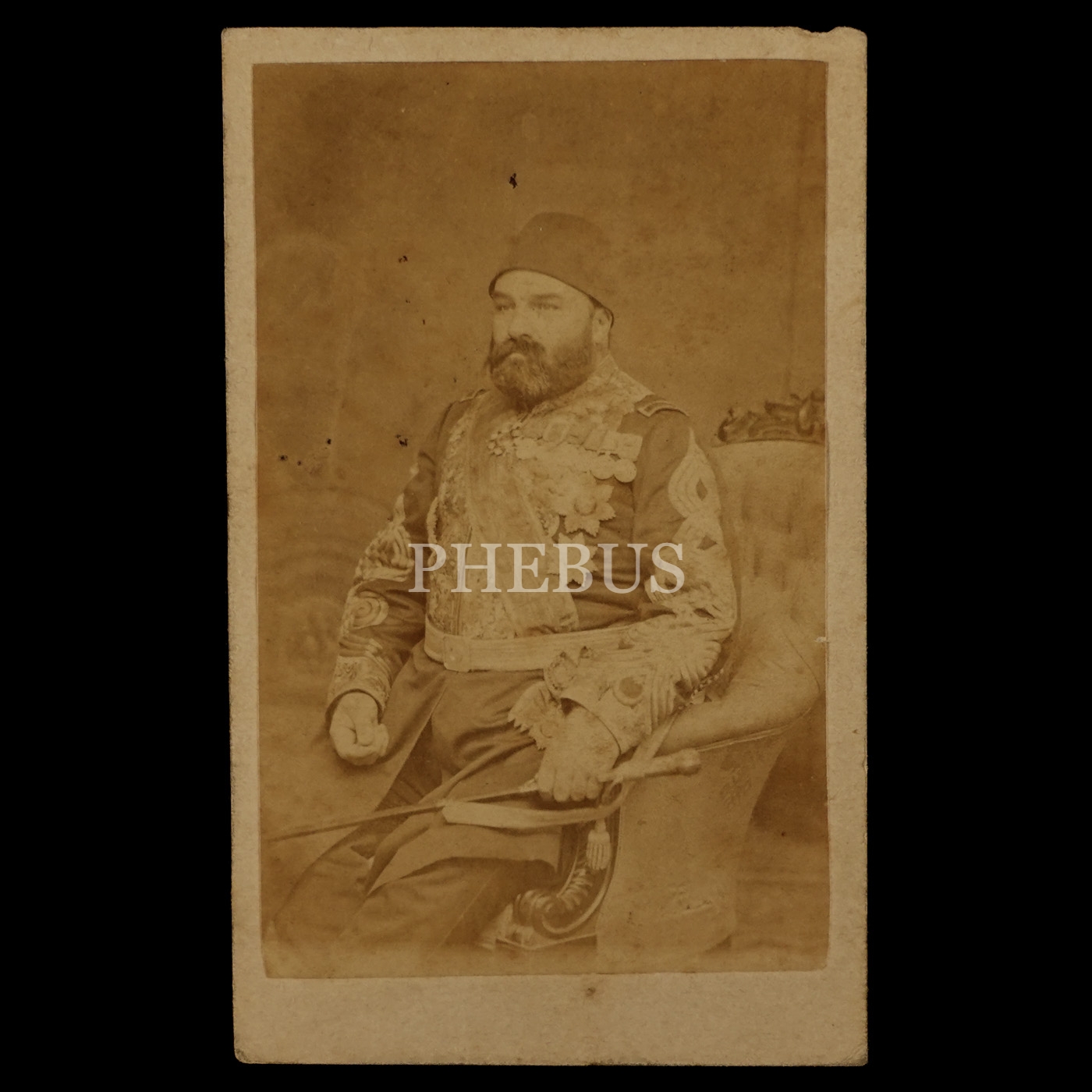 Osmanlı paşasının madalyaları ve üniformasıyla aldırdığı stüdyo hatıra fotoğrafı, J.H. Chretien & Co Fotoğrafhnesi (Malta), 6x11 cm...