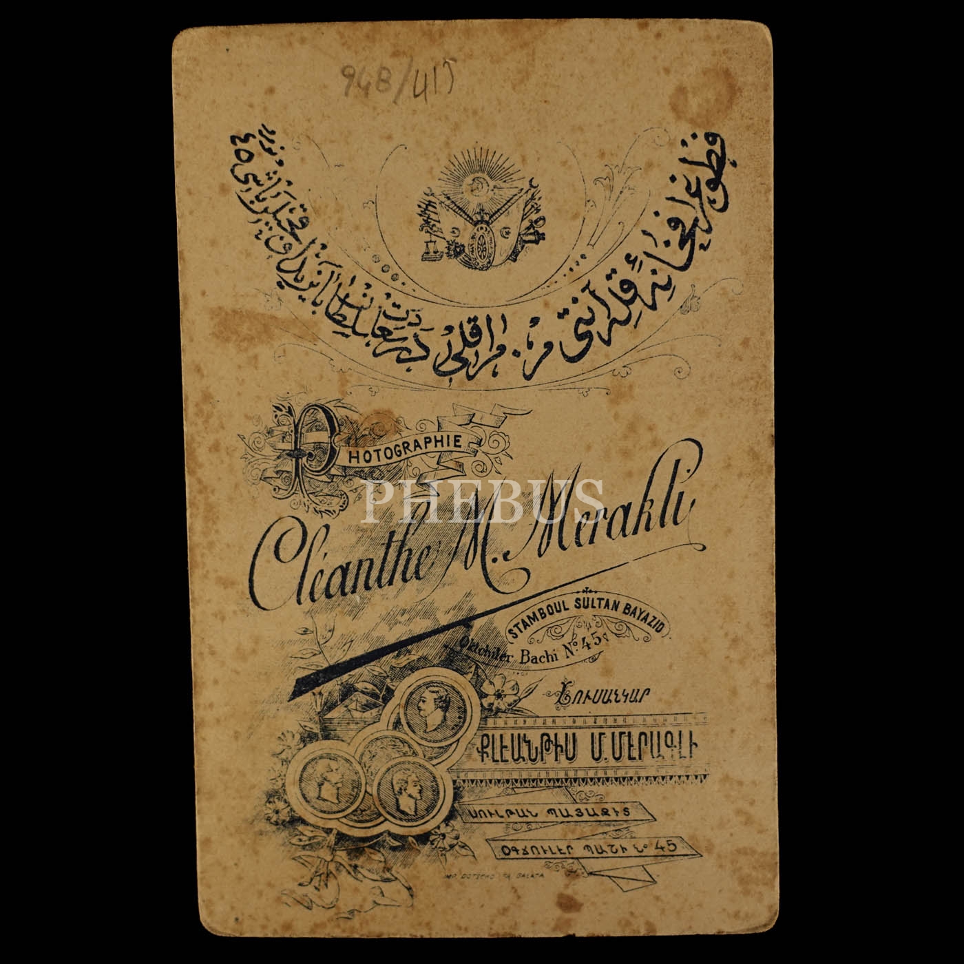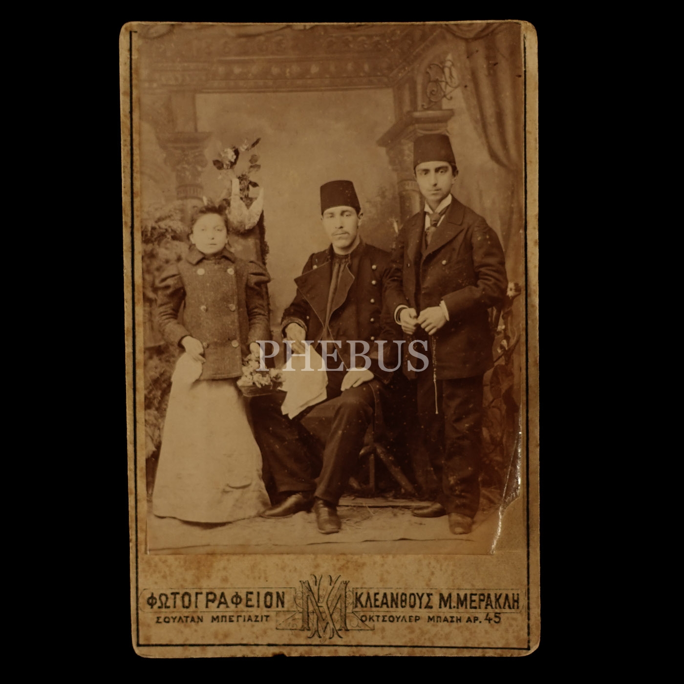 Osmanlı döneminden, bir babanın oğlu ve kızıyla beraber aldırdığı stüdyo hatıra fotoğrafı, Cleanthe M. Meraklı Fotoğrafhanesi, 11x17 cm...