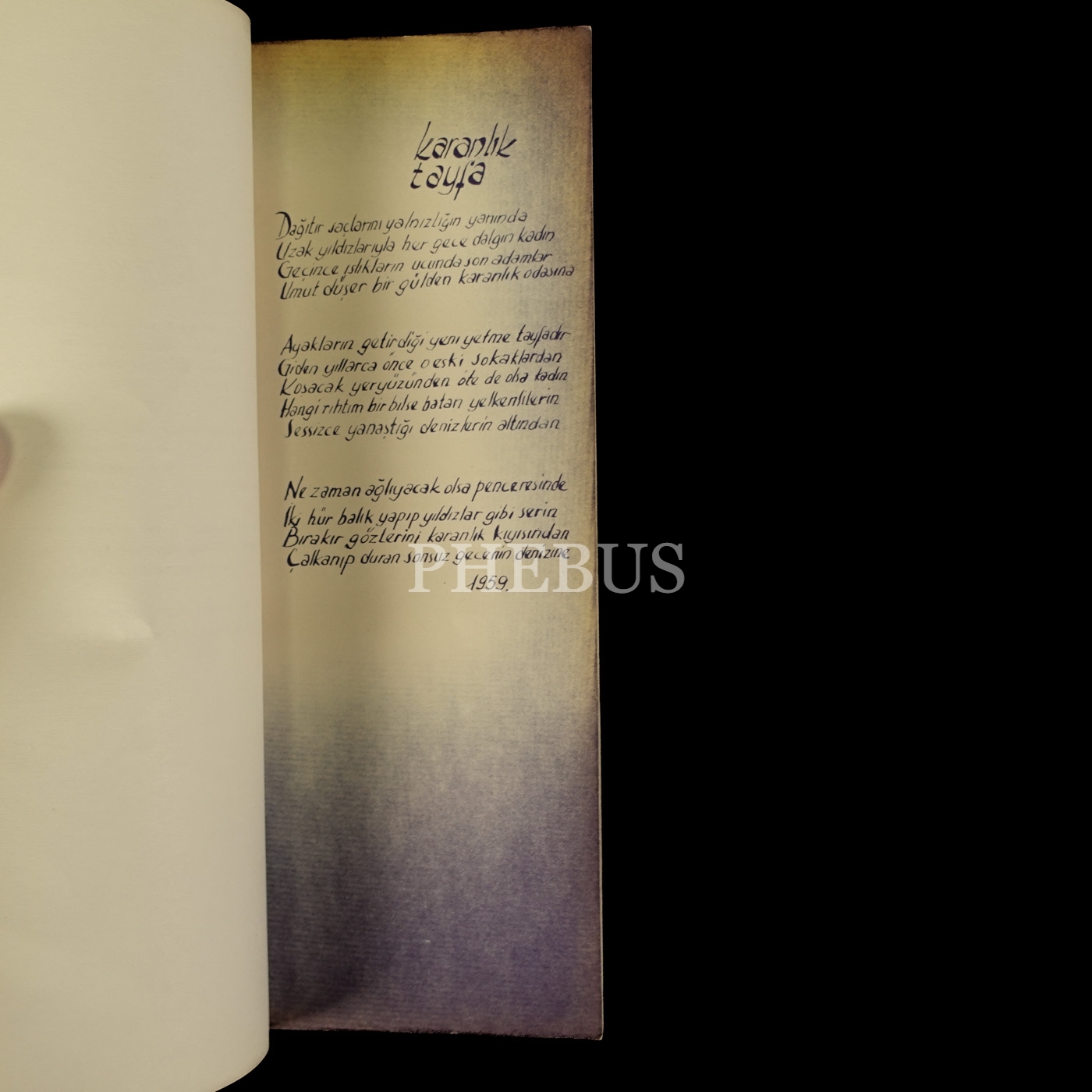 Ünlü tiyatro ve sinema sanatçısı Oben Güney'in, kendi desenleriyle birlikte, kendi imkânlarıyla fotokopi usulüyle yayımladığı yegâne şiir kitabı... "Sayın Nurullah Tilgen´e en içten saygılarımla" ithafıyla imzalanmıştır.