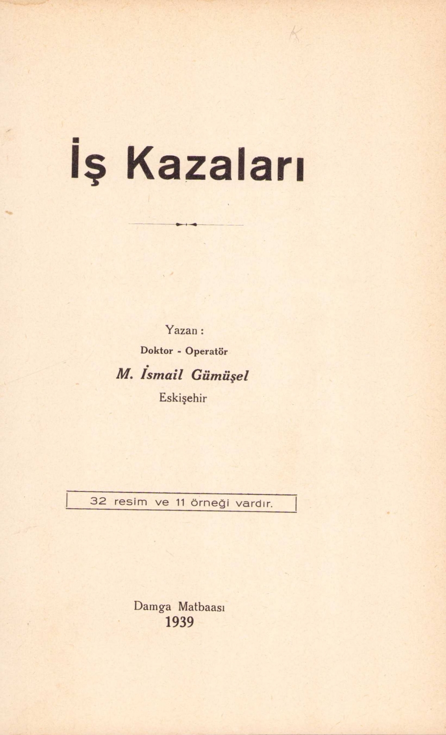 İş Kazaları, İsmail Gümüşel, Damga Matbaası, 1939, 32 resim, 183 sayfa, 15x23 cm