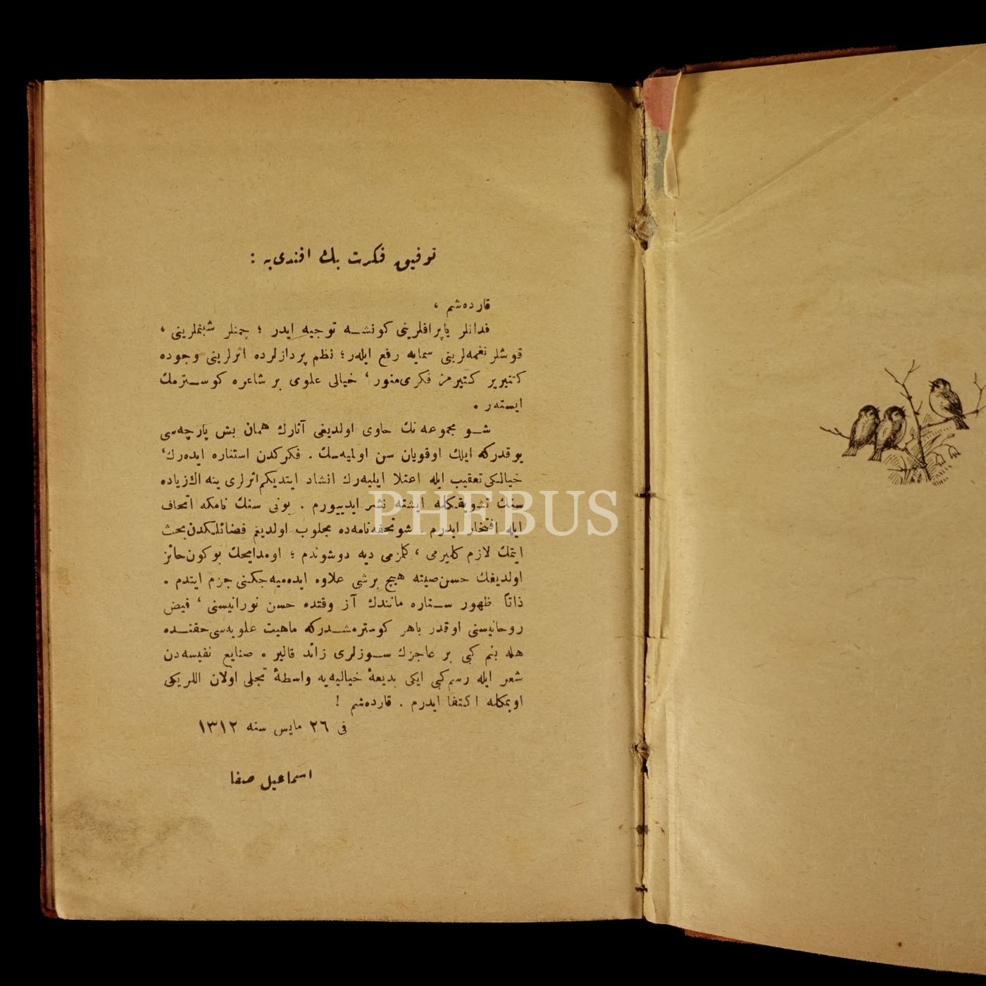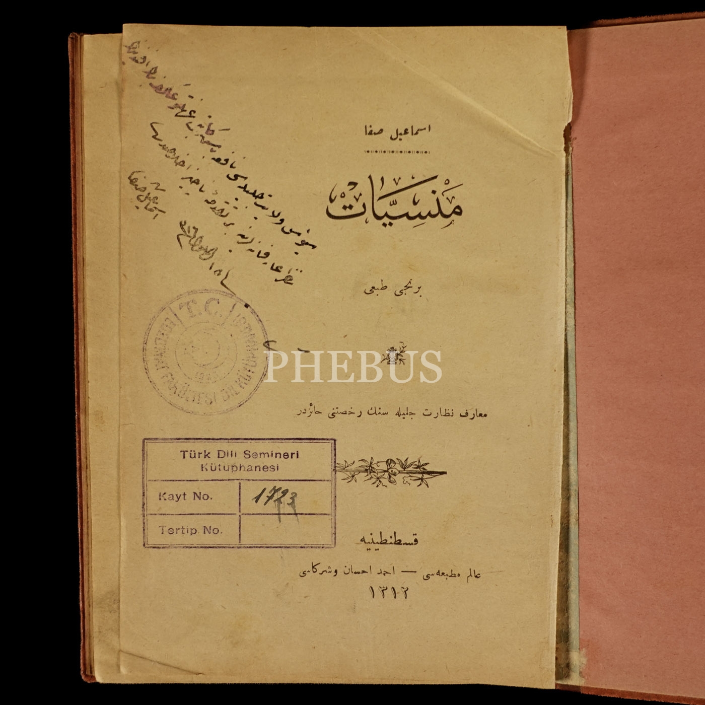 Peyami Safa'nın babası, Servet-i Fünûn'uncular arasında Tevfik Fikret'in tabiriyle "şair-i mâderzat (anadan doğma şair)" olarak bilinen İsmail Safa'nın, sürgüne gönderildiği Sivas'ta, "Sivas Vilayet-i Celilesi Nafia Başvekalet Katibi İzzetli Akif Beyefendi´ye, Nazar-ı Arifanelerine bir takdime-i naciz ihlasımdır." ithafıyla 18 Eylül 1316 tarihinde imzaladığı eseri...