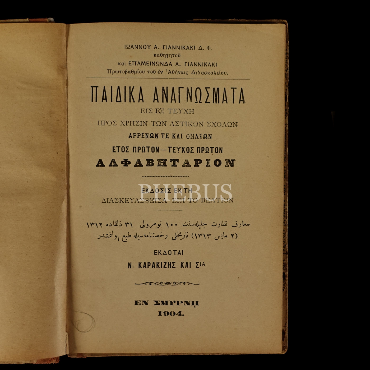 Yirminci yüzyılın ilk yıllarında İzmir´de basılmış kıraat kitabı, Rumca öğretmeye yönelik hazırlanmıştır. İçerisinde talebeler için okuma metinleri yer almaktadır.