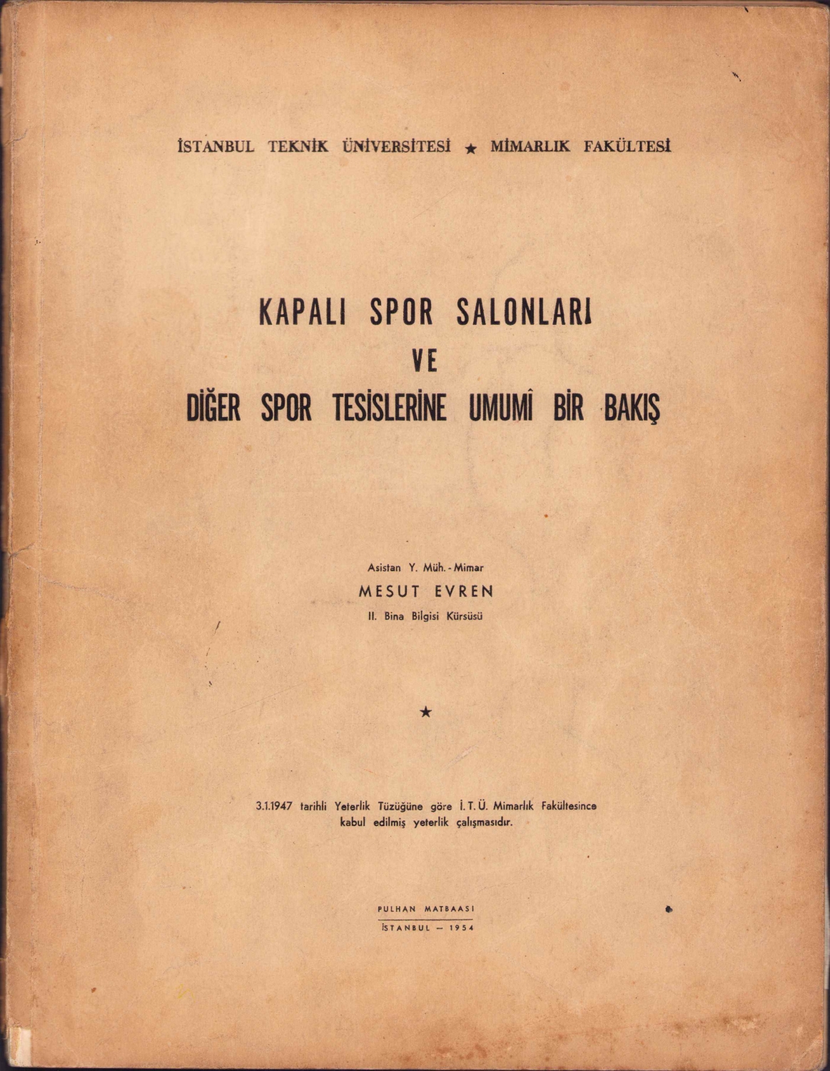 Kapalı Spor Salonları ve Diğer Spor Tesislerine Umumi Bir Bakış, Mesut Evren, İstanbul, 1954, resimli, sırtı haliyle, 85 sayfa, 24x30 cm