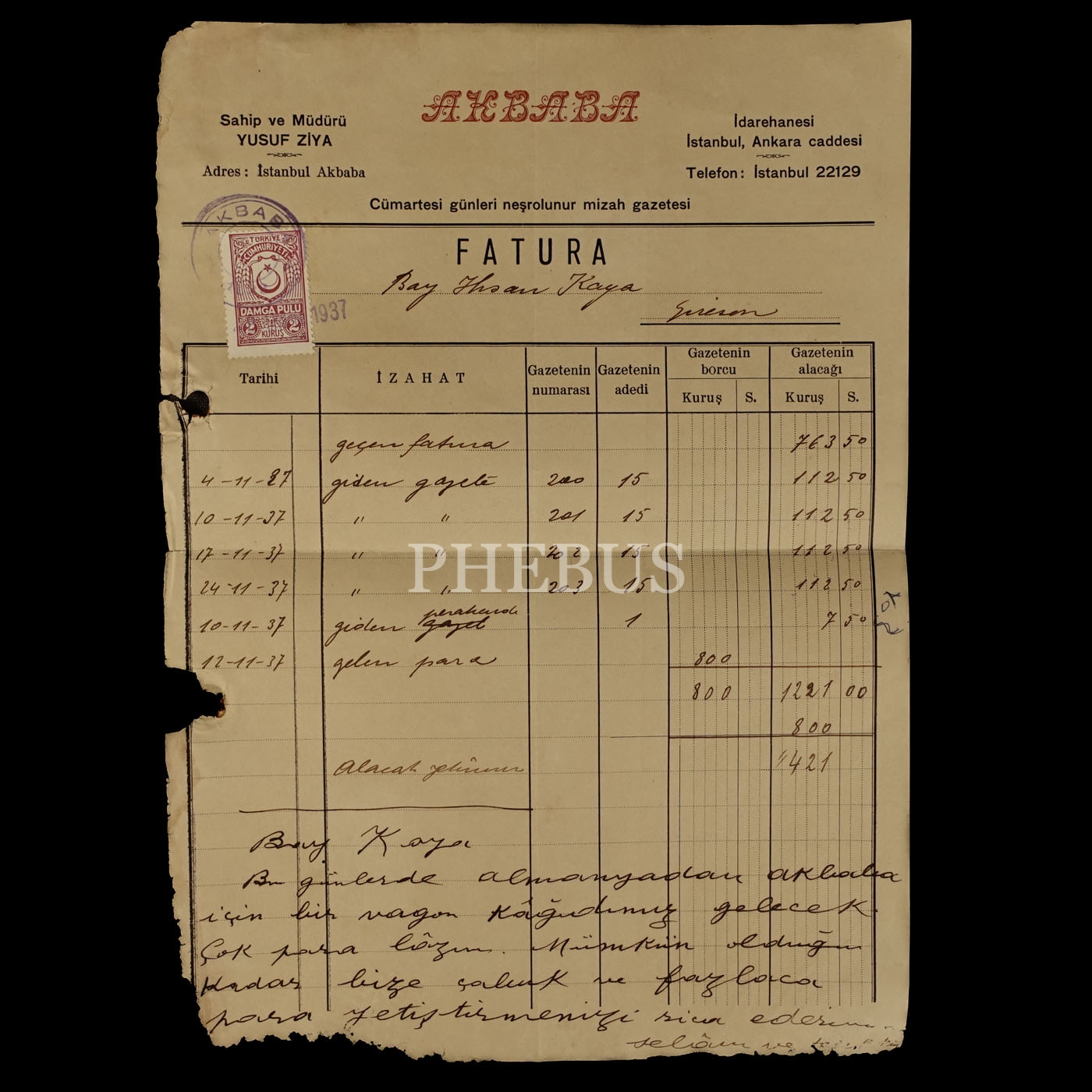 "Akbaba (Cümartesi günleri neşrolunur mizah gazetesi)" antetli, 1937 tarihli fatura, 20x28 cm...
