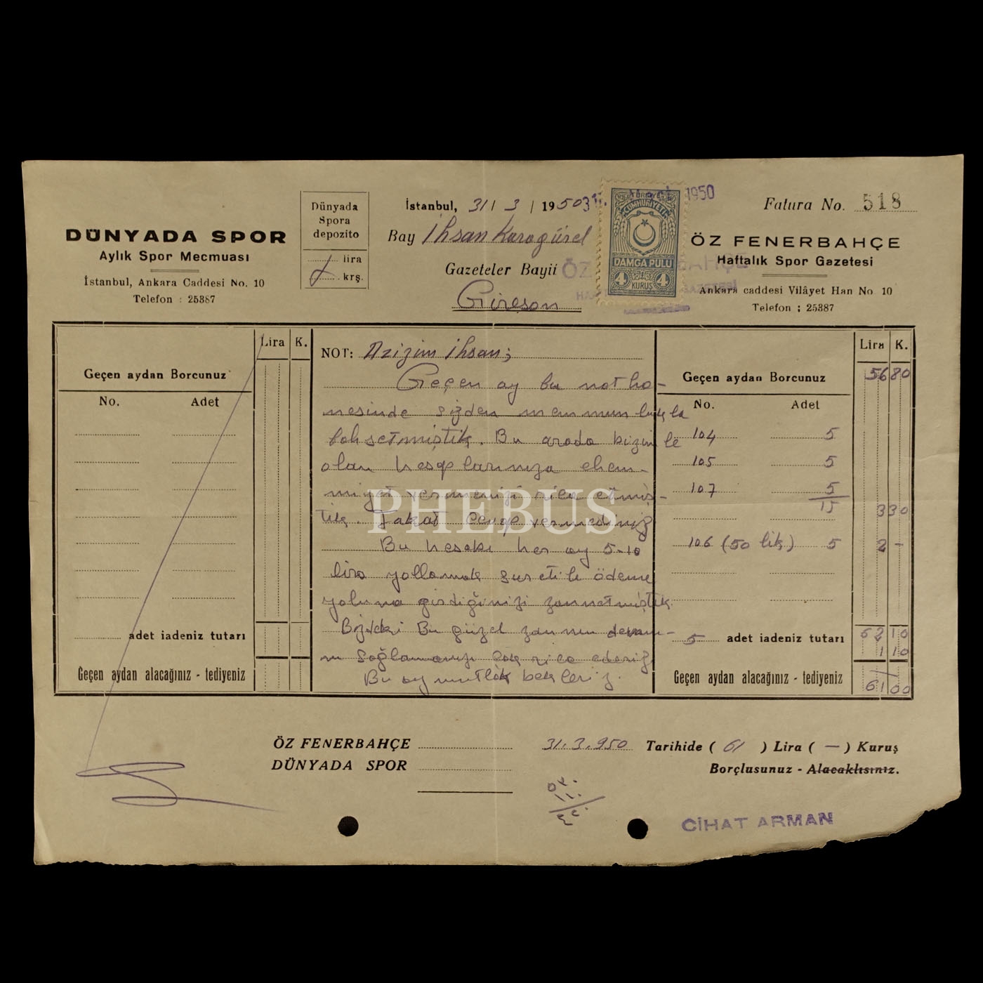 "Dünyada Spor (Aylık Spor Mecmuası)" ve "Öz Fenerbahçe (Haftalık Spor Gazetesi)" antetli, Giresun varışlı, 1950 tarihli fatura, 26x20 cm...