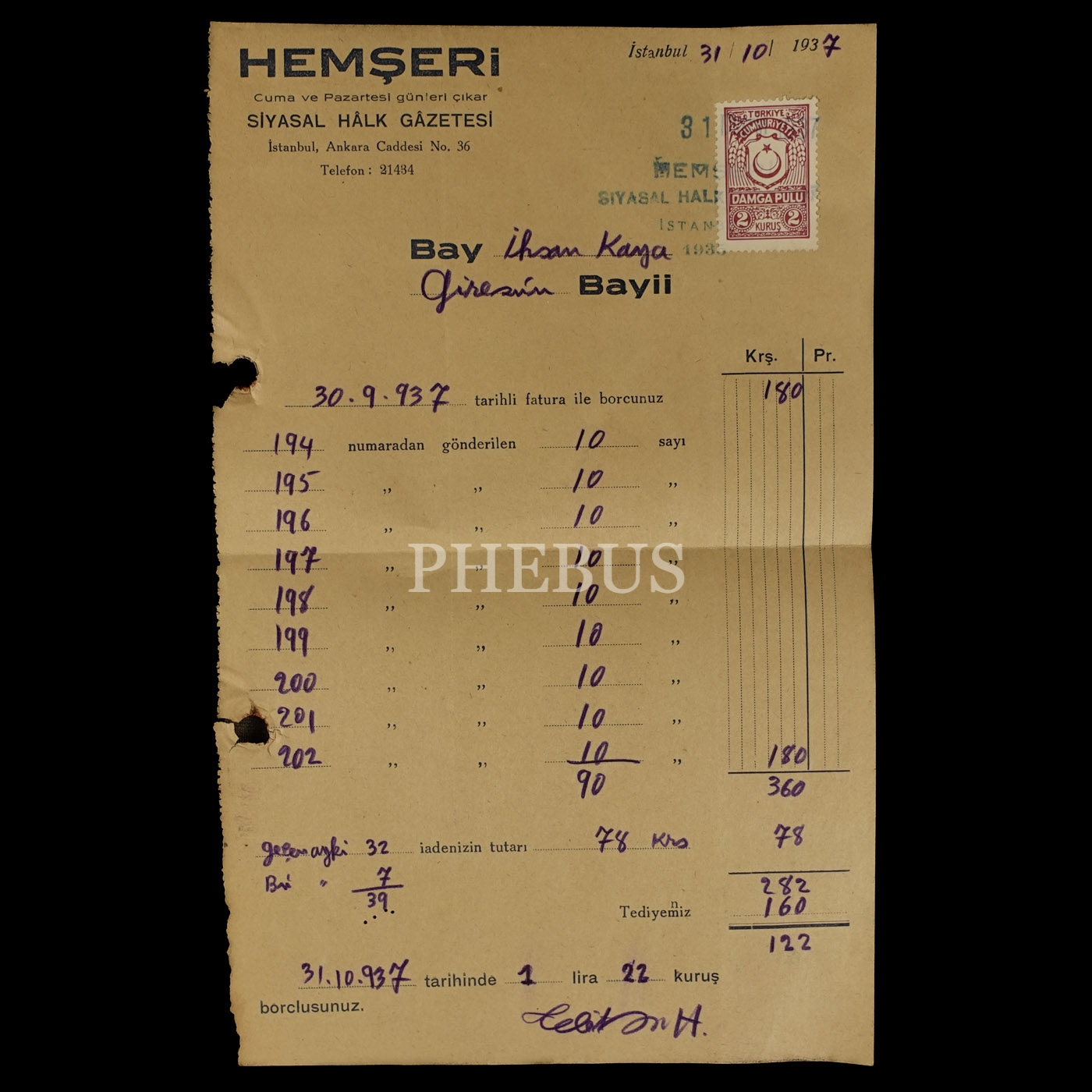"Hemşeri (Siyasal Hâlk Gâzetesi)" antetli, "Giresun Bayii" İhsan Kaya´ya kesilmiş 1937 tarihli fatura, 15x23 cm...