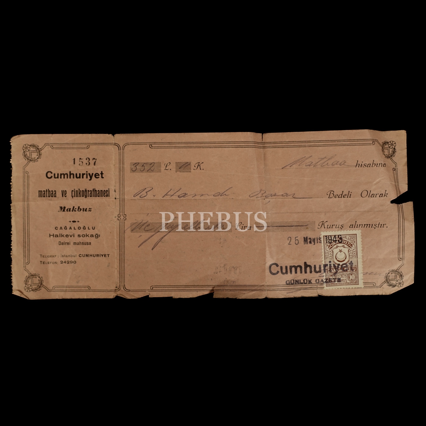 "Cumhuriyet Matbaa ve Çinkoğrafhanesi" antetli, Hamdi Başar adına kesilmiş 25 Mayıs 1948 tarihli makbuz, 23x10 cm...