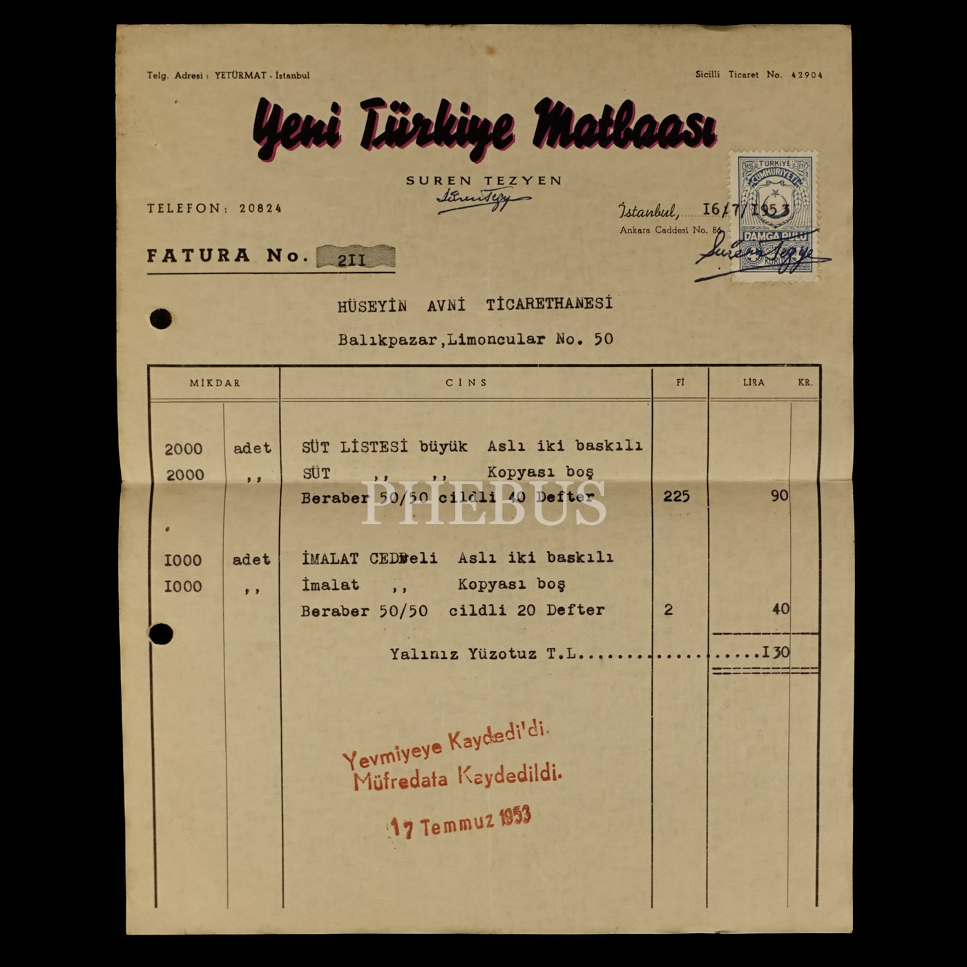 "Yeni Türkiye Matbaası (Suren Tezyen)" antetli, Hüseyin Avni Ticarethanesi (Balıkpazar) adına kesilmiş 16 Temmuz 1953 tarihli fatura, Suren Tezyen´den ıslak imzalı, 19x24 cm...