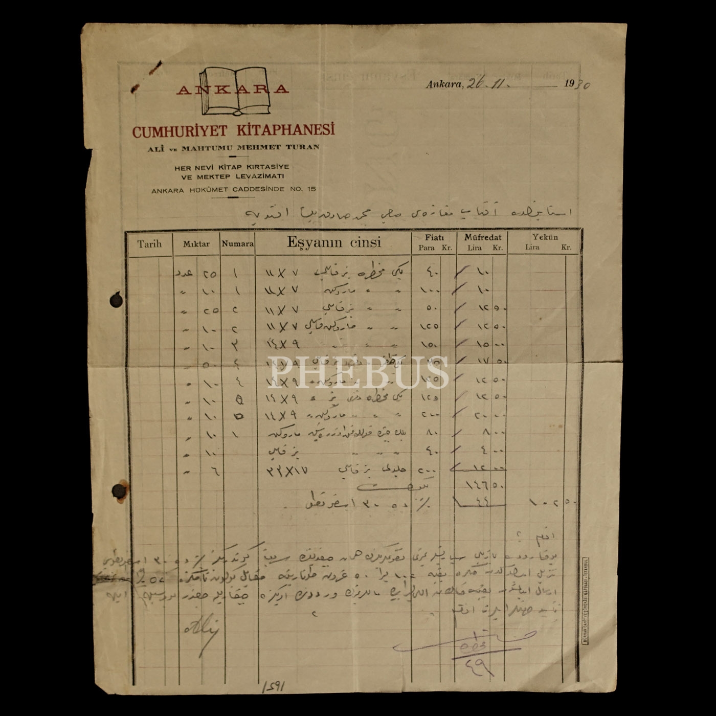 "Ankara Cumhuriyet Kitaphanesi (Ali ve Mahtumu Mehmet Turan)" antetli, İstanbul´da Afitap Mağazası sahibi Mehmet Sadık Efendi adına kesilmiş 26 Kasım 1930 tarihli fatura, 22x28 cm...