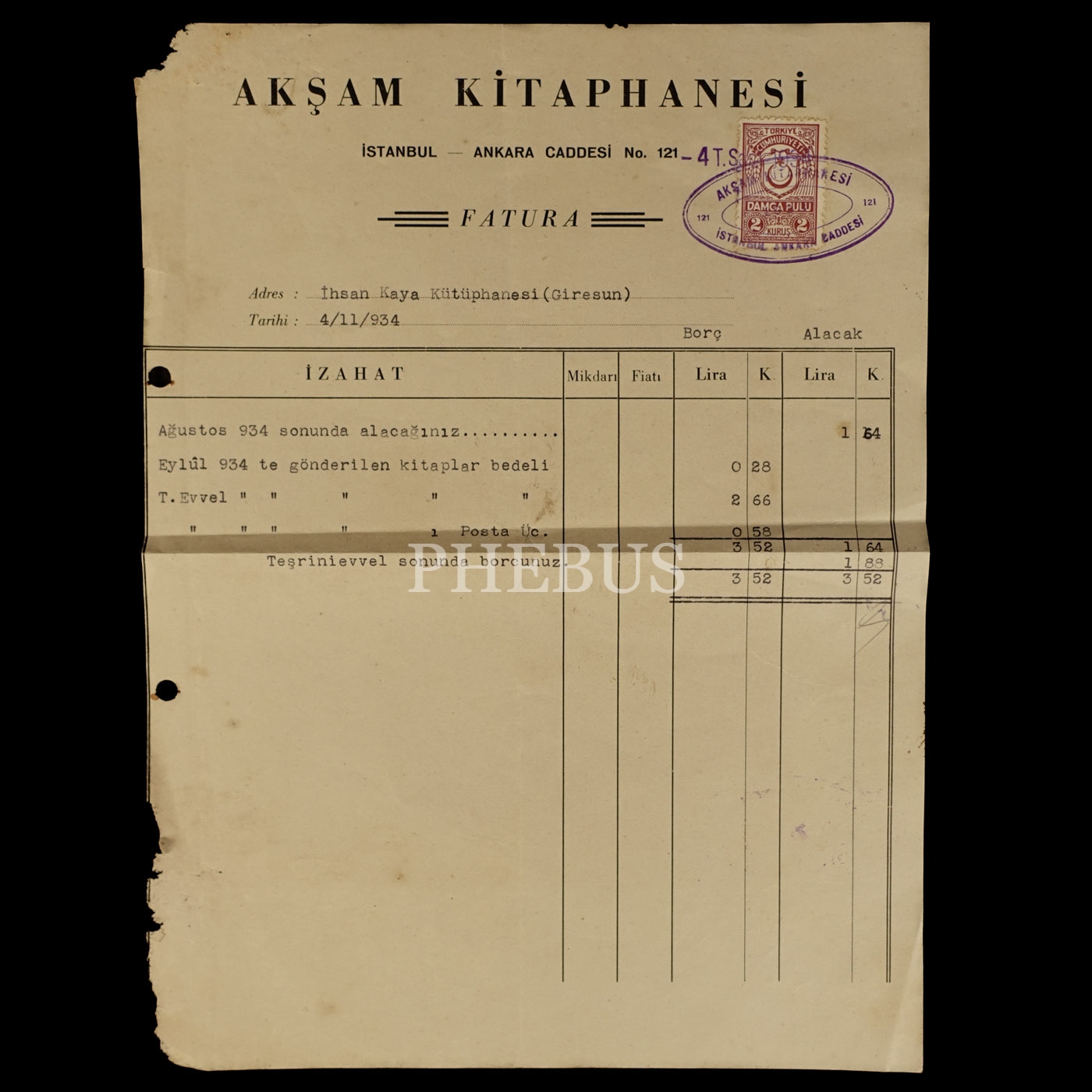 "Akşam Kitaphanesi" antetli, İhsan Kaya Kütüphanesi (Giresun) adına kesilmiş 4 Kasım 1934 tarihli fatura, 20x27 cm...