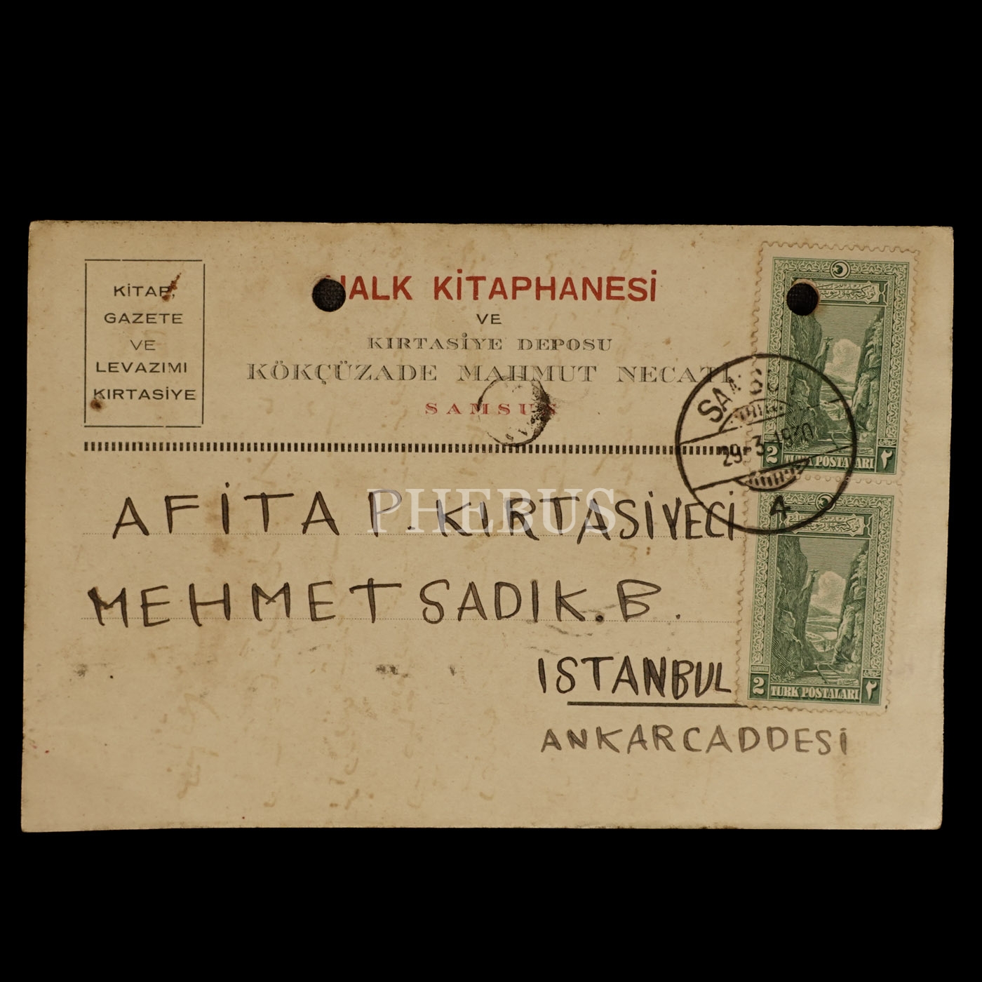 Afitap -Kırtasiye- Mağazası sahibi Mehmet Sadık tarafından doldurulmuş Halk Kitaphanesi ve Kırtasiye Deposu sipariş kartı, 29 Mart 1930, 16x10 cm...